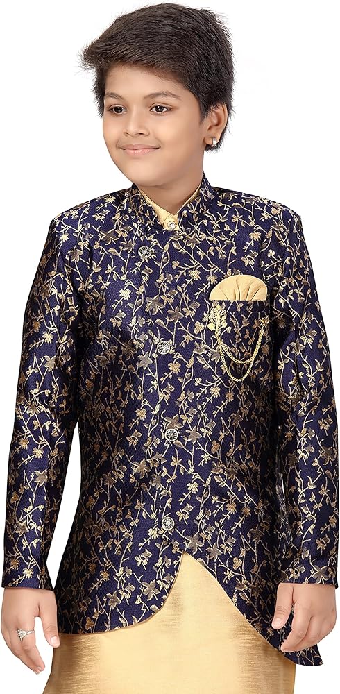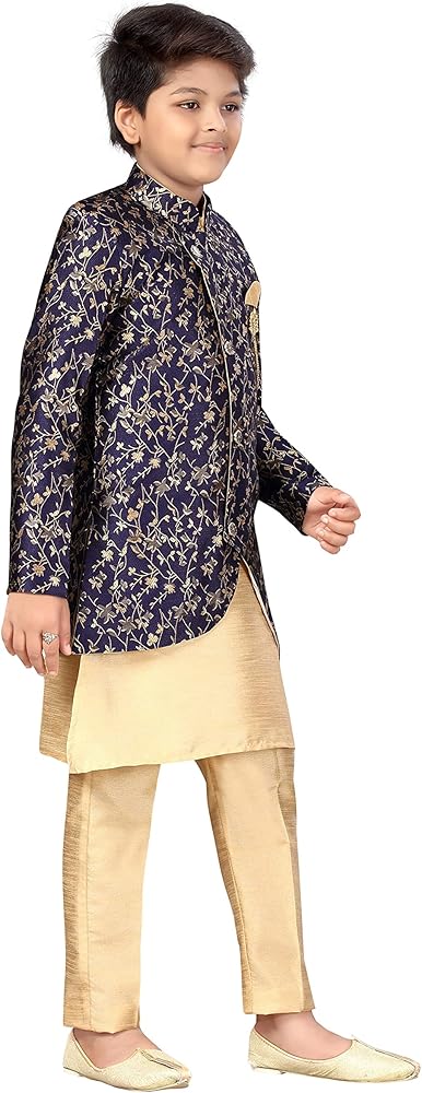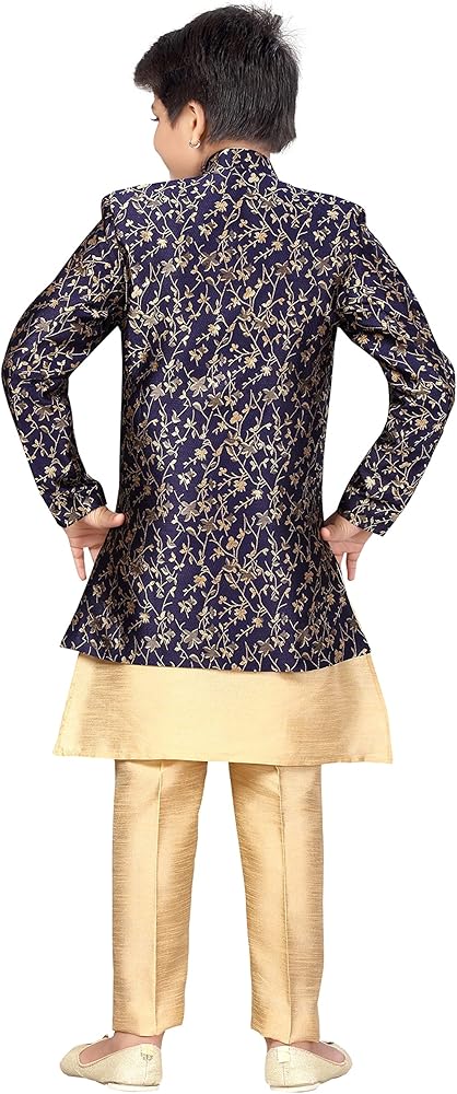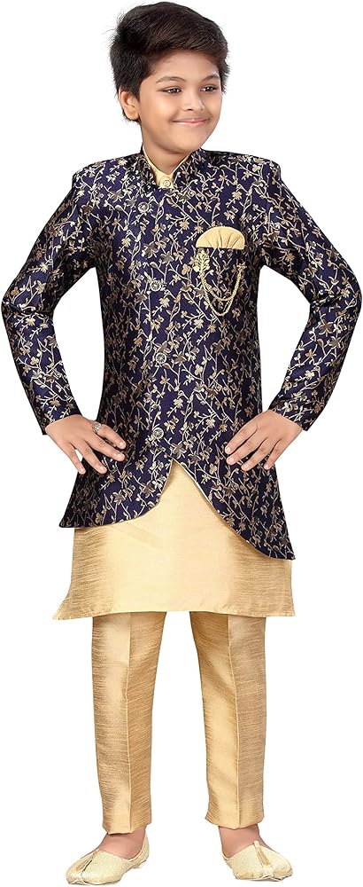 من منزل "ahhaaaa"، هذه الملابس العرقية الهندية الغربية/الشيرواني مع كورتا وبيجامة للأطفال الأولاد. توجد تصميمات جميلة للأزرار والبروش على الفتحة تضيف جمالًا إلى المجموعة العرقية!
