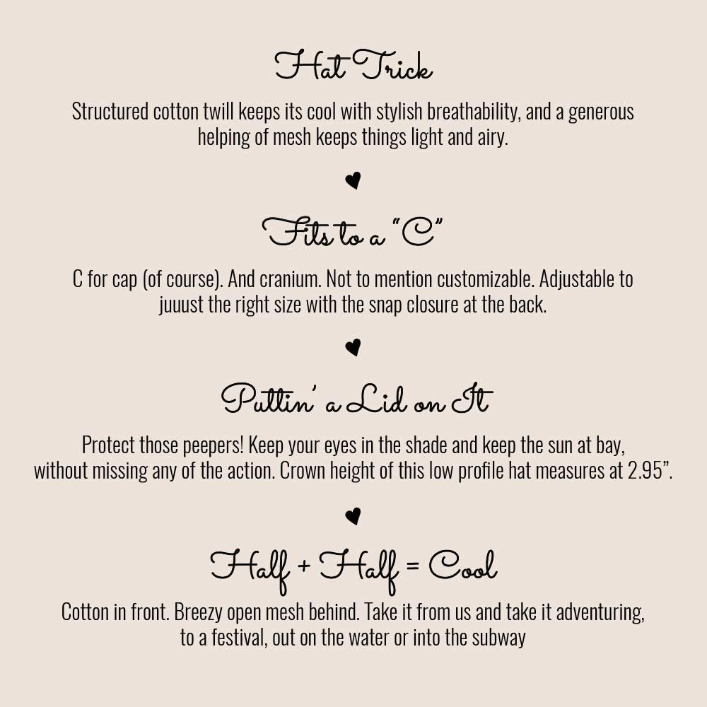 الخامة والنسيج: قطن من الأمام مع شبكة مفتوحة من الخلف. خذها منا وخذها إلى المغامرة أو إلى المهرجان أو في المياه أو في مترو الأنفاق. فائقة النعومة من الداخل والخارج مع طبقات إضافية من الحشو، يمكنك ارتداء هذه القبعة بسهولة طوال اليوم.