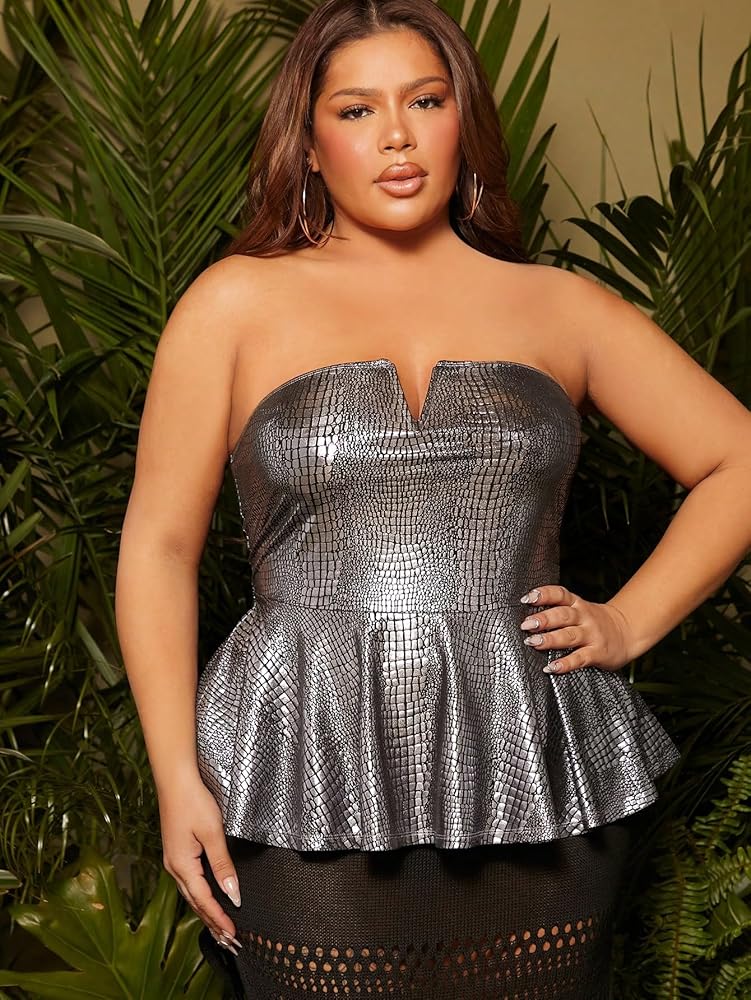 • السمات: بدون أكمام، بدون حمالات، حمالة صدر على شكل حرف V، حاشية واسعة، نقش تمساح، يبدو لامعًا