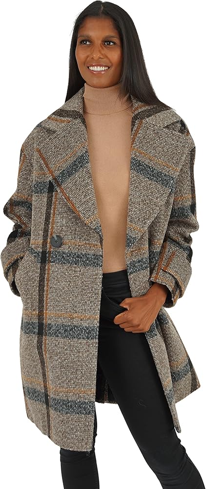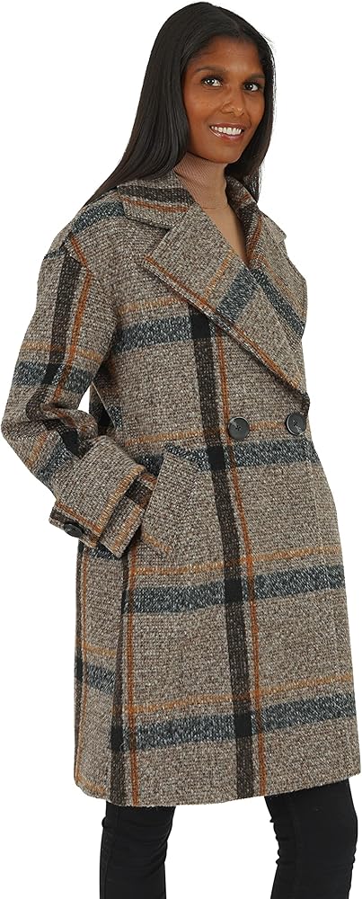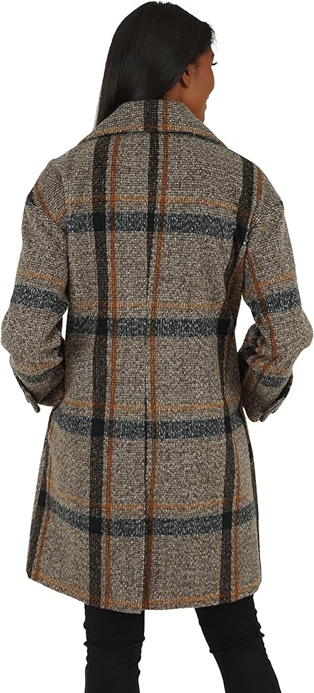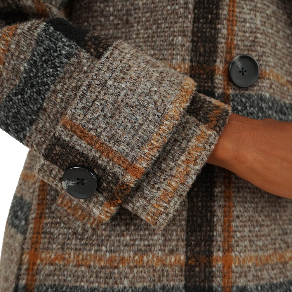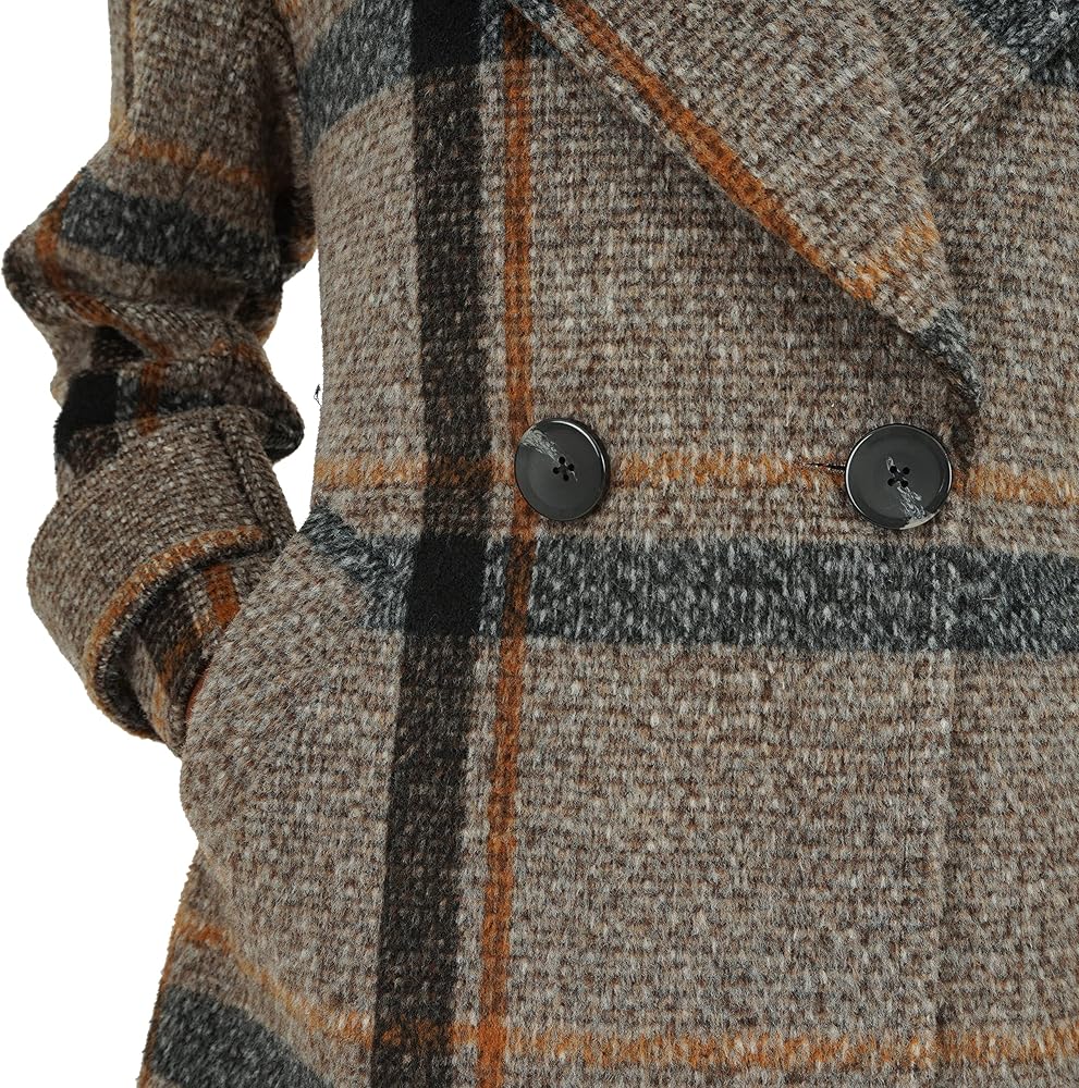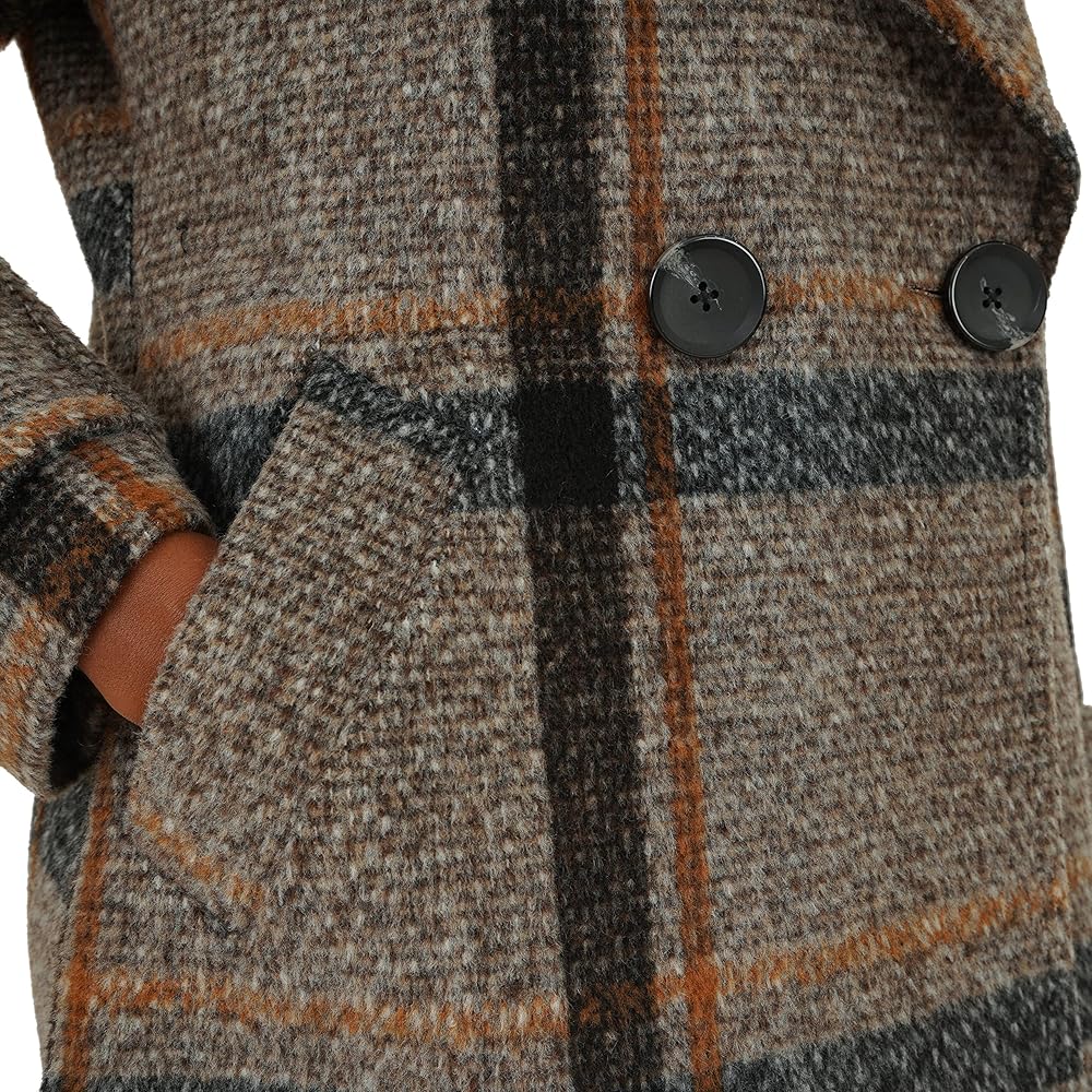 • المنتج - معطف من الصوف الصناعي المنقوش بطول 98.58 سم تحت الركبة وأزرار أمامية مزدوجة الصدر