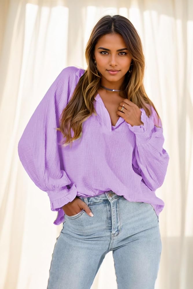 بلوزات قطنية للنساء أنيقة كاجوال برقبة على شكل حرف V بلوفر فضفاض وقميص أنيق بأكمام طويلة