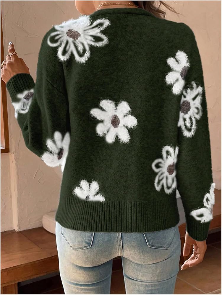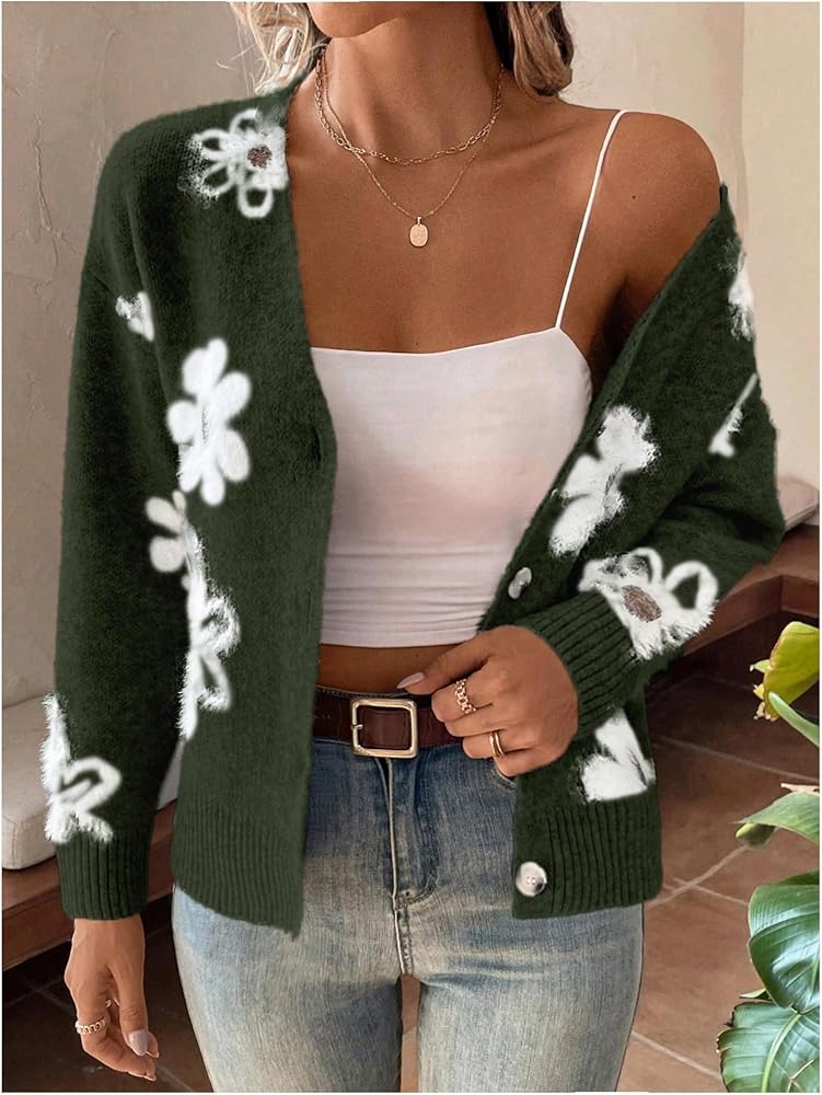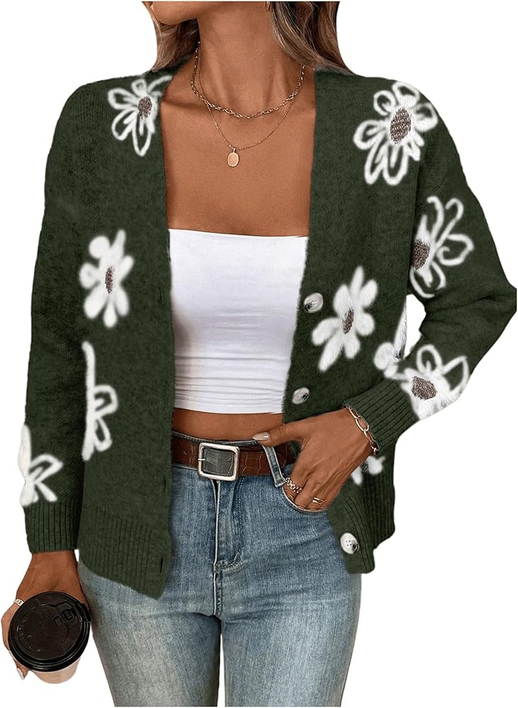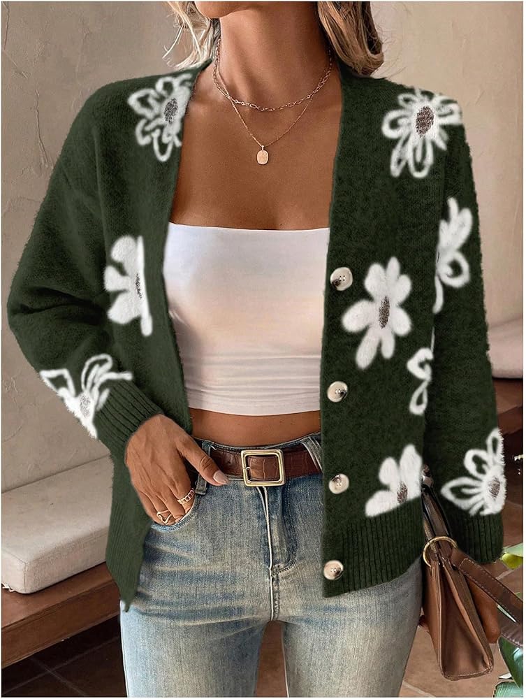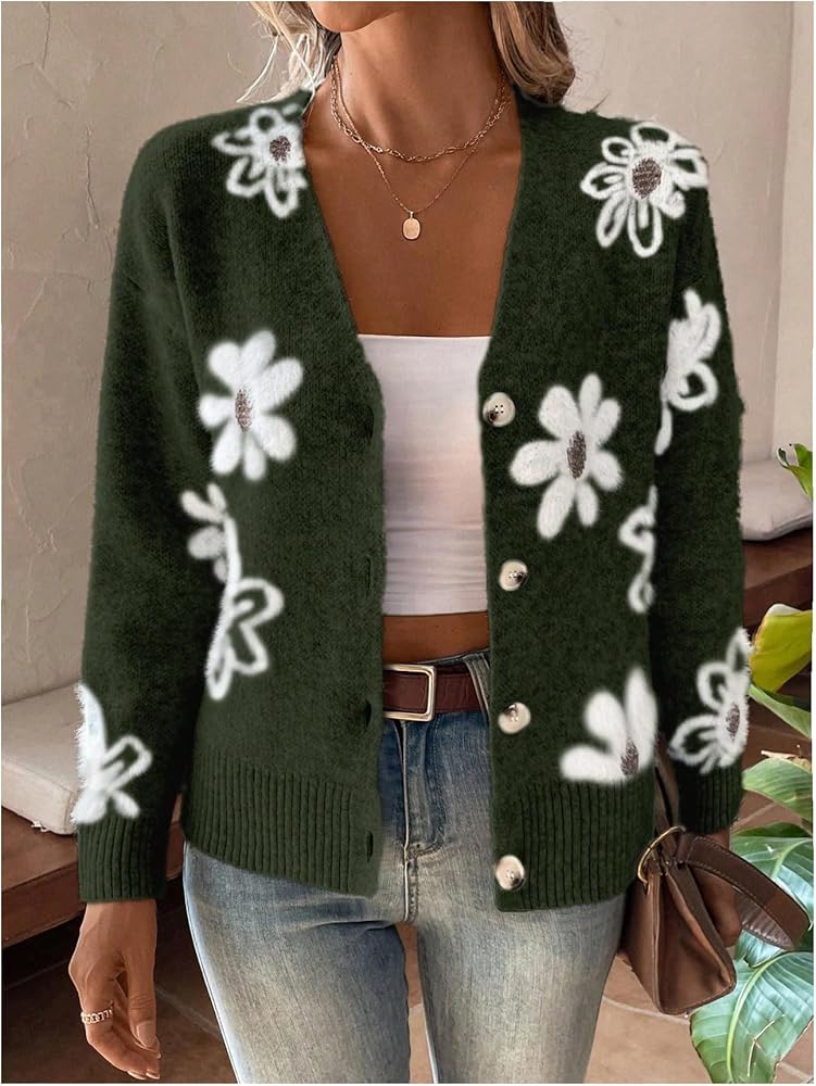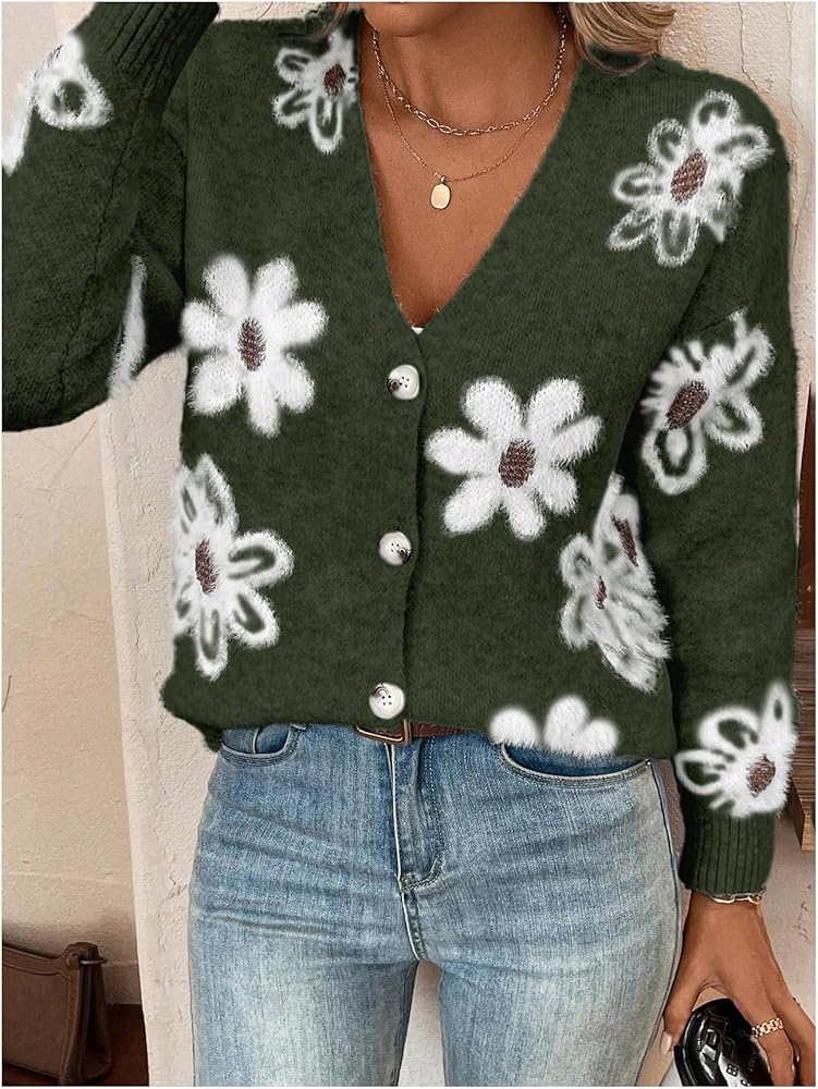 - المزايا: سترة نسائية بأزرار سفلية، طباعة زهور، رقبة على شكل حرف V، كتف منسدل، كم طويل