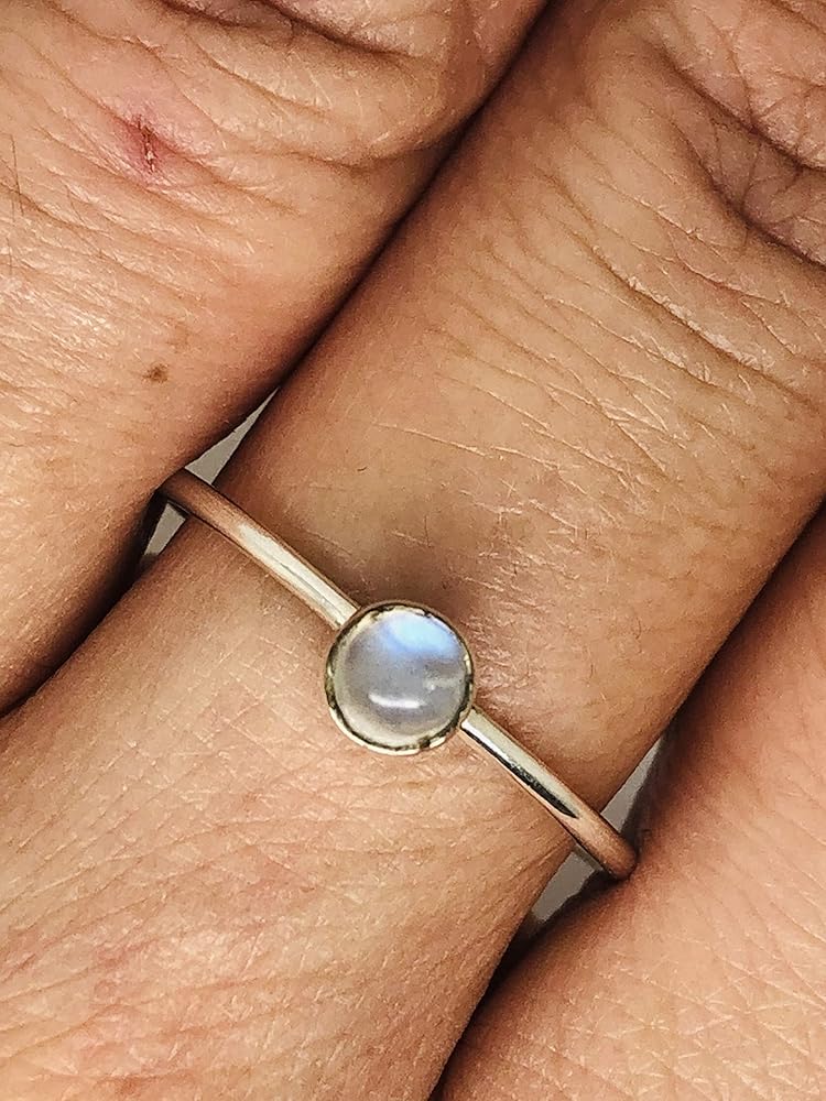 • كل حلقة فريدة من نوعها - نظرًا لتنوع الألوان في حجر القمر الطبيعي، فإن كل حجر مختلف. تتكون كل جوهرة من اللون الأبيض الحليبي البراق مع أشكال مختلفة من اللون الأزرق أو الرمادي أو الوردي أو الأخضر والتي تظهر بشكل عشوائي تمامًا في الطبيعة. الفضة الكلاسيكية، الطراز البسيط والحجر الذي يبدو متوهجًا من تحت السطح، يجعل هذا الخاتم مثاليًا للارتداء في أي وقت وفي أي مناسبة.