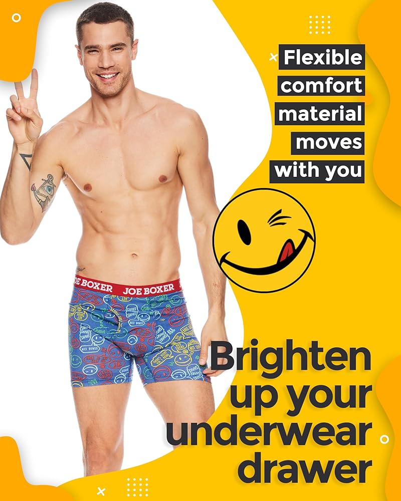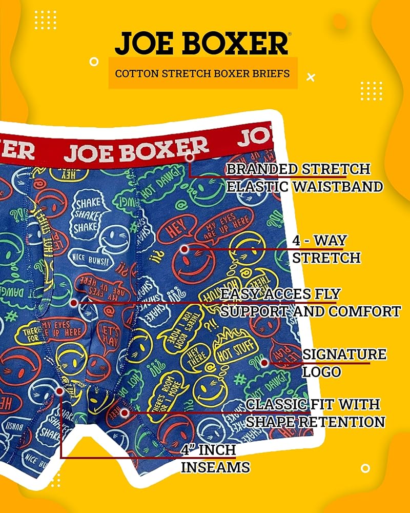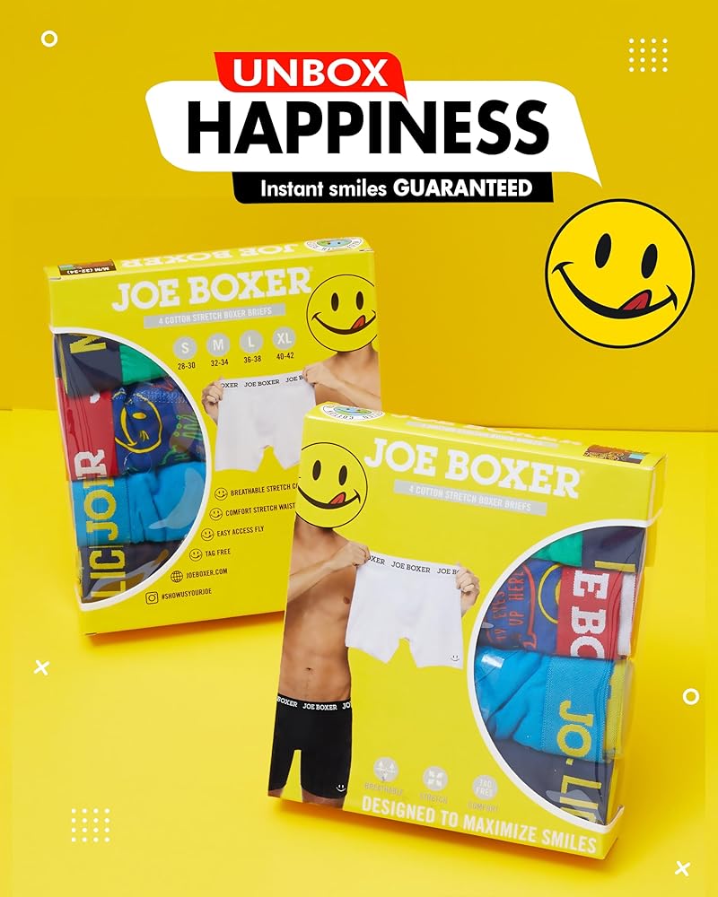 تم تصميم جو بوكسر لتحقيق أقصى قدر من الابتسامات: سراويل داخلية مريحة من القطن المطاطي مكونة من 4 قطع رياضية وحزام خصر مطاطي متباين مع شعار جو بوكسر المتكرر. وجه مبتسم مميز يبرز الفخذ الأمامي