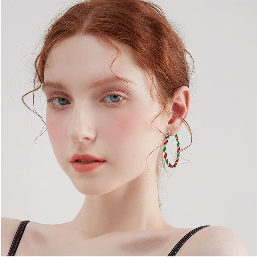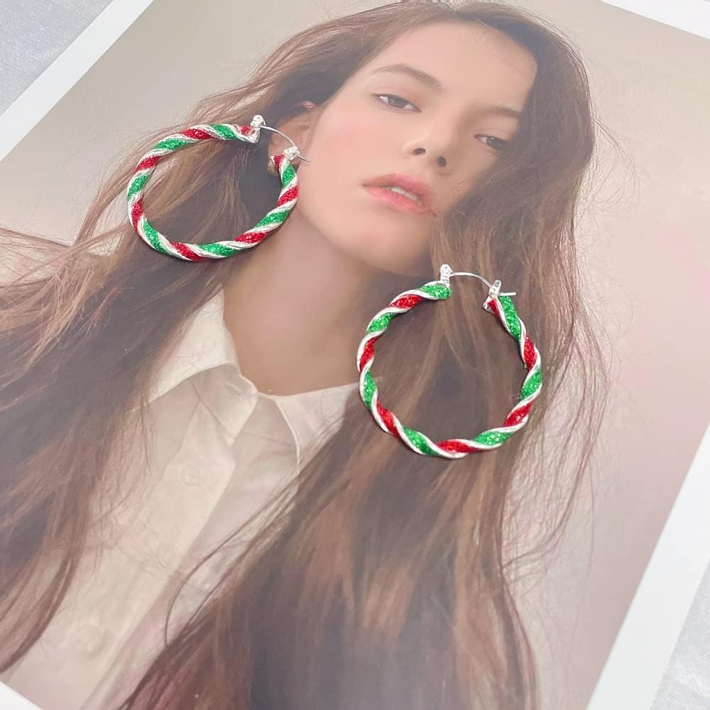 Dainty Christmas كبيرة كبيرة مستديرة هوب الأقراط للنساء الفتيات الأحمر الأخضر المينا زخرفة إكليل عطلة عيد الميلاد بريق تويست Huggie الأطواق حلقة القرط سحر الأزياء والمجوهرات هدية لابنة Bff لها حزب عيد الشكر السنة الجديدة مهرجان 40mm