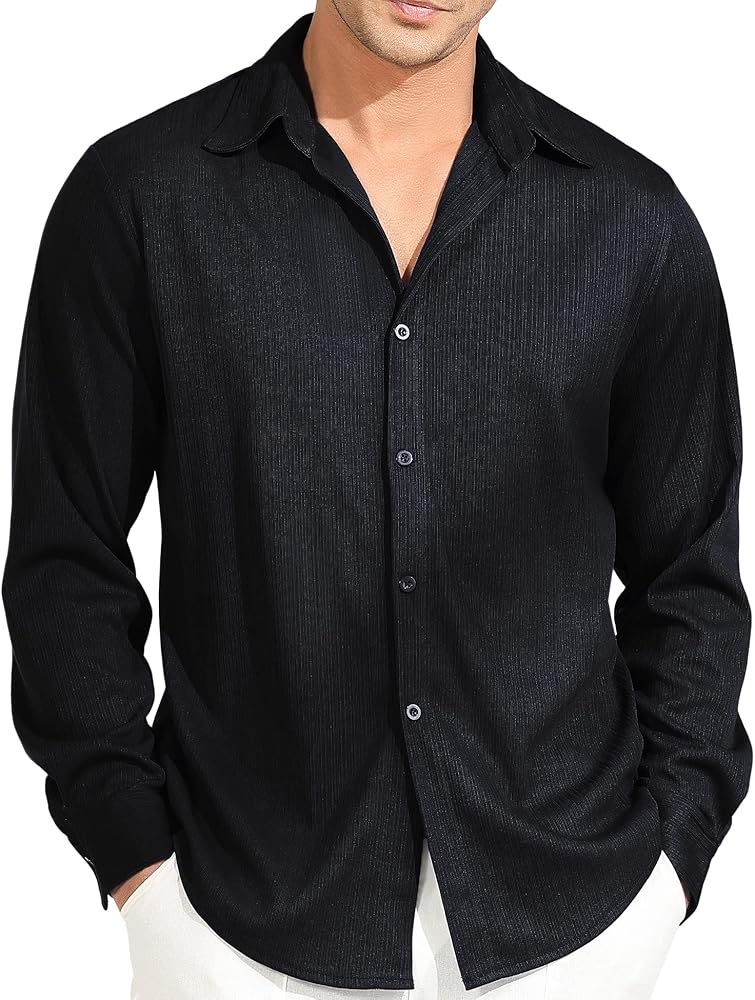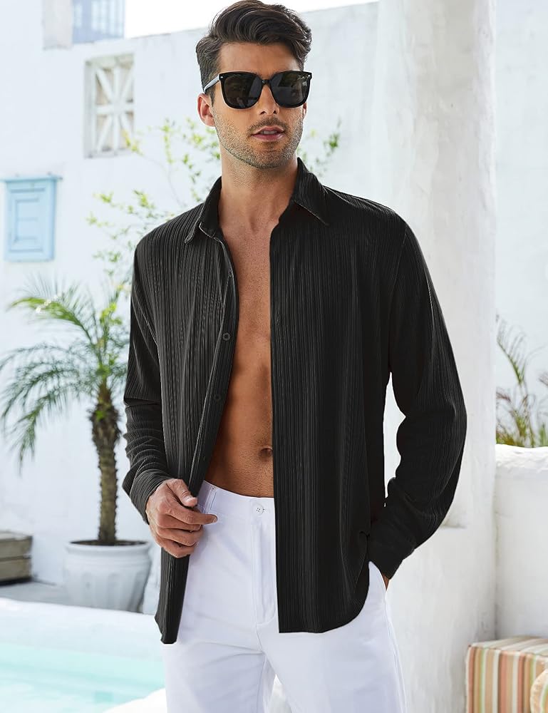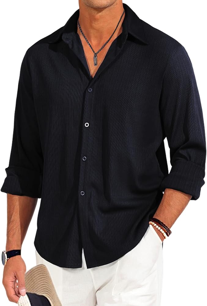 【تصميم منسوج مضلع】يتميز هذا القميص المضلع بأزرار لأعلى بأكمام طويلة، وملاءمة عادية، وإغلاق بأزرار سفلية، وياقة مطوية إلى الأسفل، وتفاصيل نسيج مضلعة تجعل قميص الشاطئ هذا ملفتًا للنظر حقًا. التصميم البسيط والكلاسيكي ذو اللون الصلب يجعله لا يصبح قديم الطراز أبدًا.