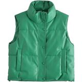 سترة منتفخة قصيرة من جلد البولي يوريثان، سترة منتفخة لملابس خارجية دافئة ولامعة، مبطنة، حاشية بأربطة، ياقة واقفة، بدون أكمام، سحاب كامل، جيبان جانبيان، لون ثابت