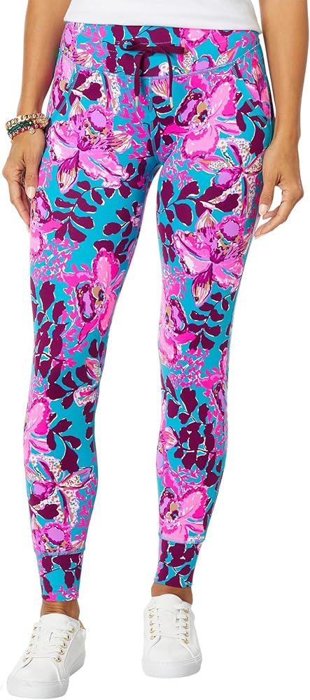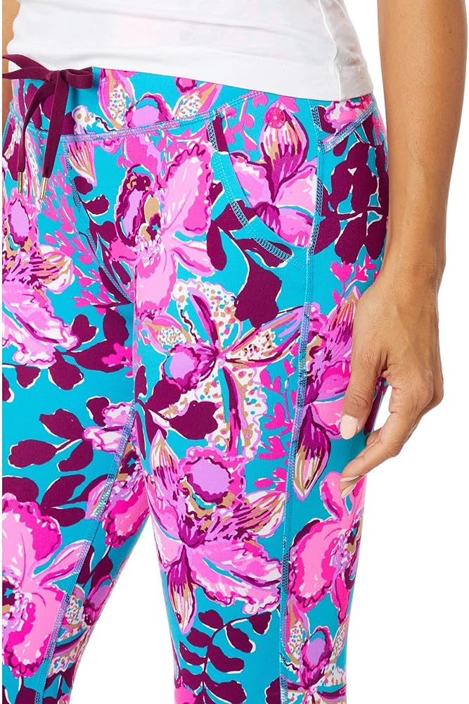 Flaunt your versatile look and feel comfy all day wearing the Lilly Pulitzer Island Mid Rise Jogger Up. It features elasticized waistband with drawstring closure, two side pockets on the front, and allover vibrant floral design. The silhouette is intended to sit below natural waist. UPF 50+. protection. Pull-on construction. Ankle-length silhouette. 88% polyester, 12% spandex. Machine washable. Measurement: Inseam: 28"