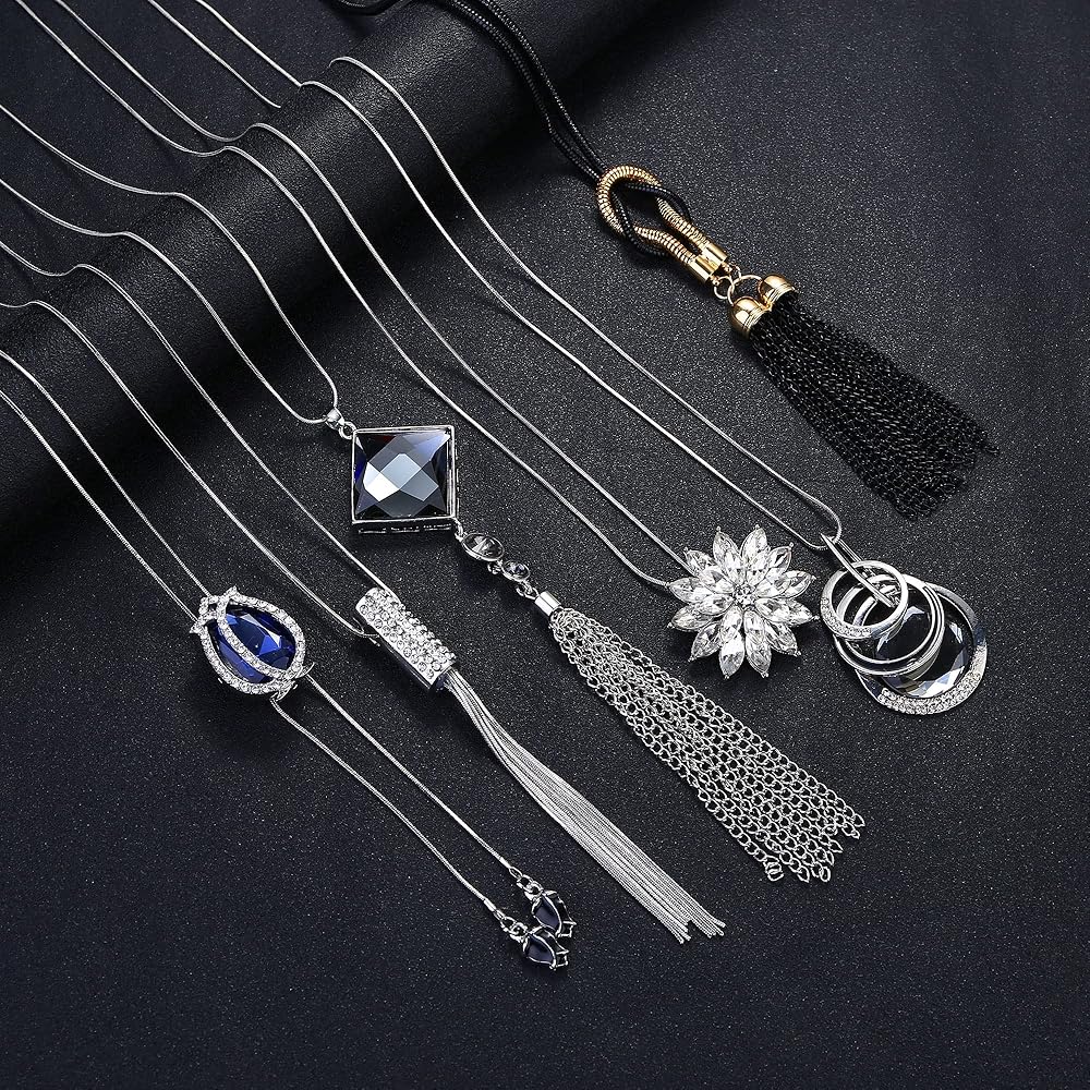 [جودة عالية] مجموعة قلادات طويلة مصنوعة من سبيكة عالية الجودة صديقة للبيئة، خالية من الرصاص والنيكل، ولا تسبب الحساسية، ومتينة، وليس من السهل أن تبهت. مصقول بدرجة عالية مع سطح القلادة، مما يمنحك ملمسًا ناعمًا ومريحًا. قلادات مرصعة بالكريستال والحجر اللامع، لامعة وجميلة.