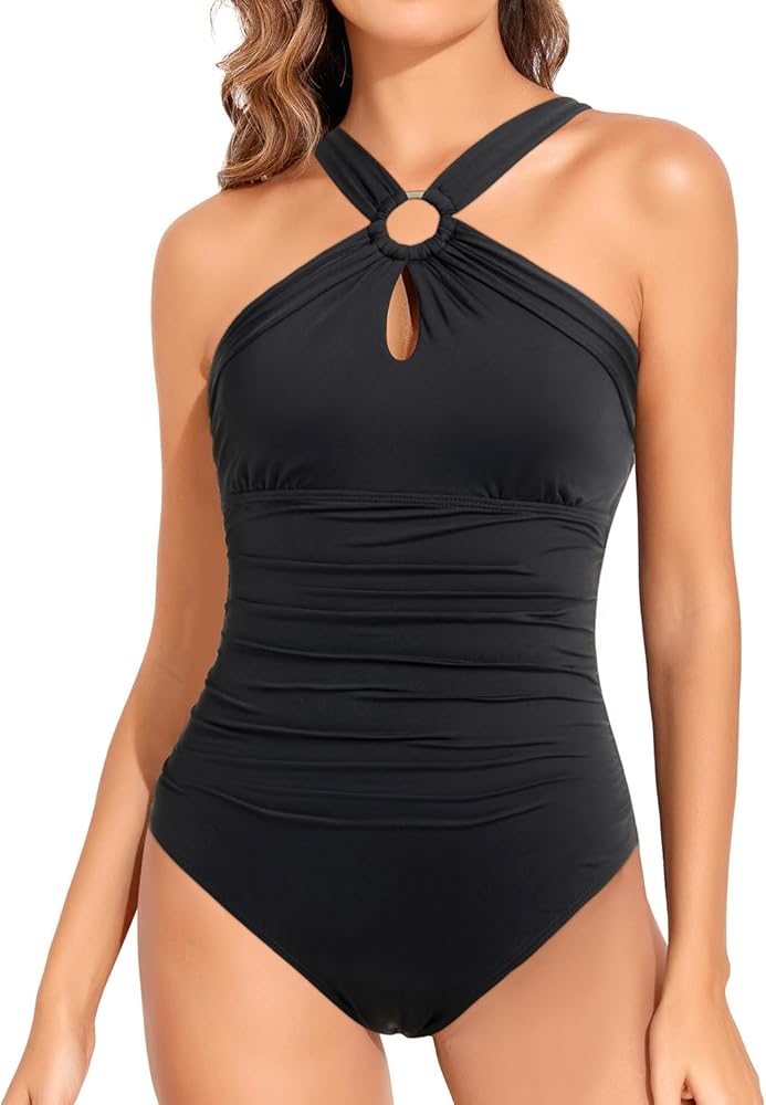 ملابس سباحة برقبة عالية للنساء: تتميز ملابس السباحة هذه برقبة عالية بتصميم متقاطع ومقطع، مما يضيف لمسة من الموضة إلى ثوب السباحة الكلاسيكي هذا.