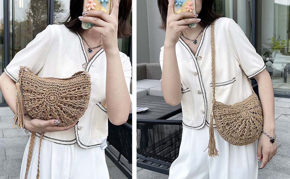 يمكن لحقيبة القش أن تحمل مرآة مستحضرات التجميل والنظارات والمحفظة والمفاتيح وسماعات الأذن والكاميرا الصغيرة والهاتف الخلوي وغيرها من الأشياء الصغيرة. إذا كنت من محبي الموضة، فهذا هو الخيار الأفضل لك. هذه الحقيبة تجلب الطبيعة والفريدة والأنيقة.