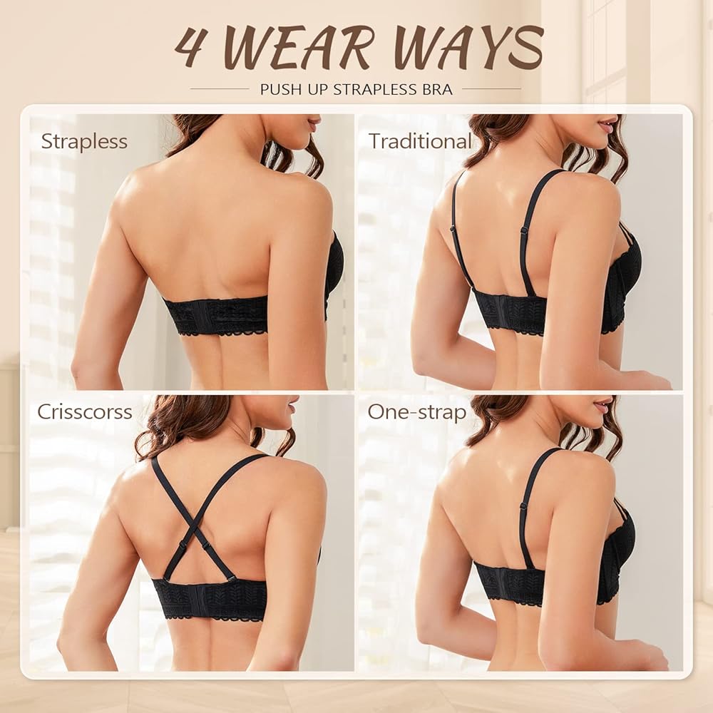 - تتميز حمالة الصدر المصنوعة من الدانتيل بدون حمالات بأكواب من الدانتيل الزهرية، مما يجعل حمالة الصدر بدون حمالات أنثوية ومثيرة.