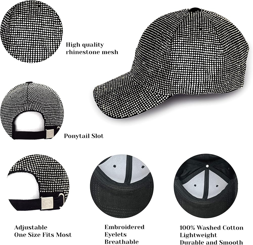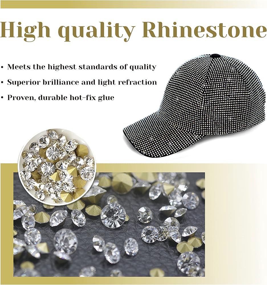 حجر الراين عالي الجودة: قبعة البيسبول مغطاة بشبكة من حجر الراين عالي الجودة، كريستال، وليس حجر الراين الراتنجي. جميعها مخيطة يدويًا، مريحة، مسامية ومتينة. اختر لونًا مختلفًا ليتناسب مع ملابسك الأنيقة.