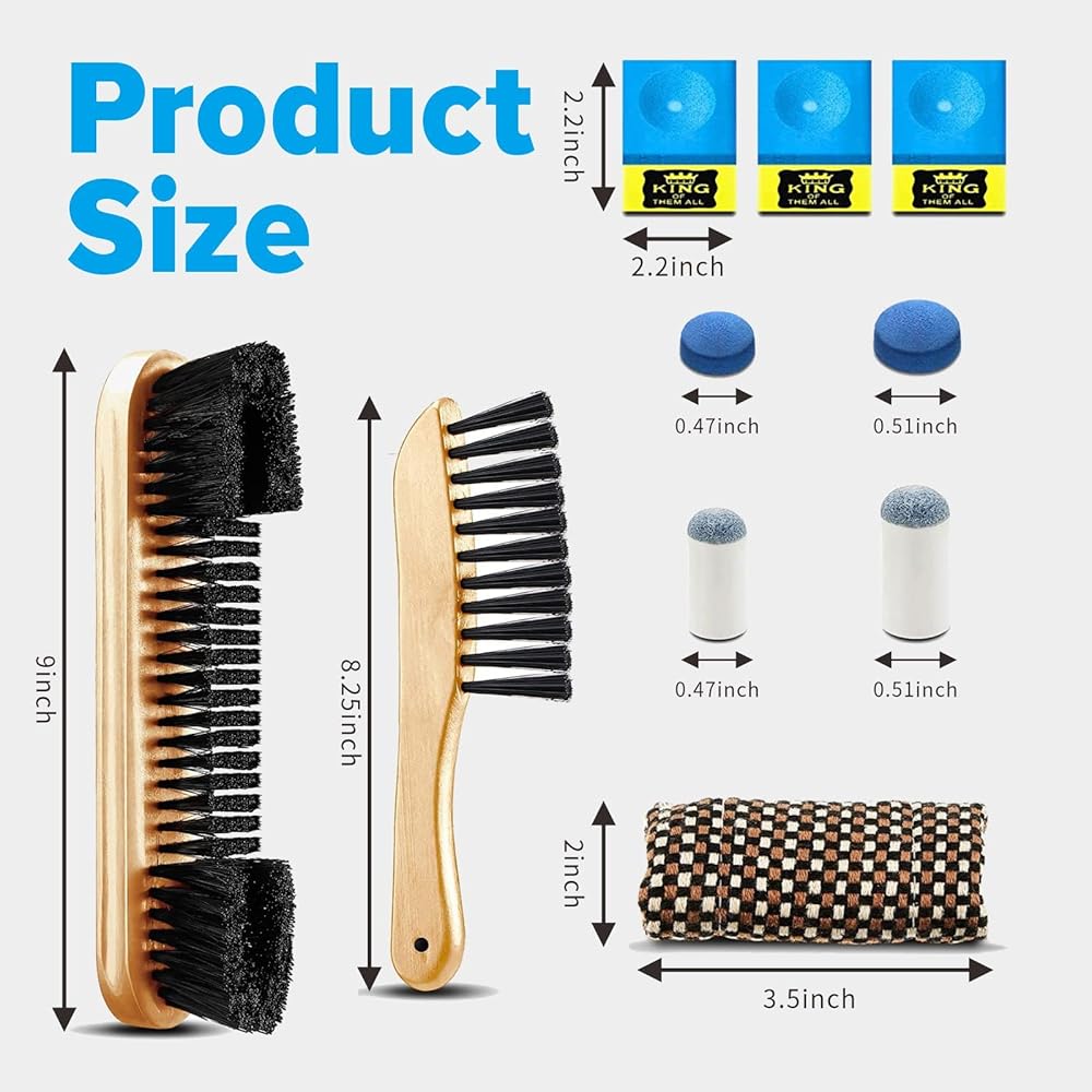 يبلغ طول منظف طاولة البلياردو حوالي 8.5 انش و9 انش على التوالي، وحجم قطعة قماش التنظيف حوالي 2 × 4 انش، ومكعب الطباشير الأزرق حوالي 0.9 × 0.9 انش، طول أطراف القضيب حوالي 0.5 انش، طرف العصا الزرقاء حوالي 0.2 انش في سُمك ملحقات البلياردو الصغيرة حجم مناسب للاستخدام والتخزين.