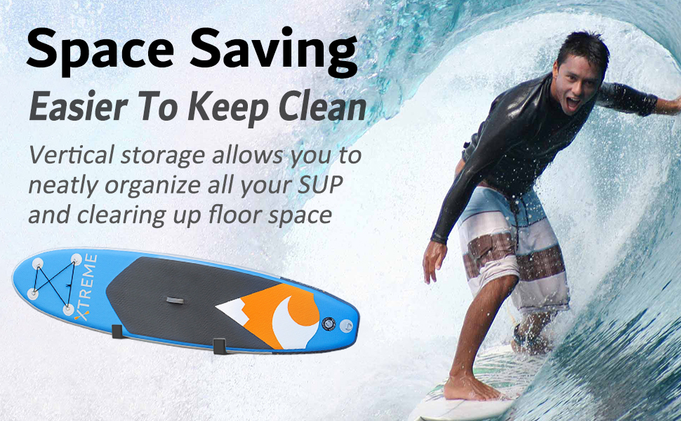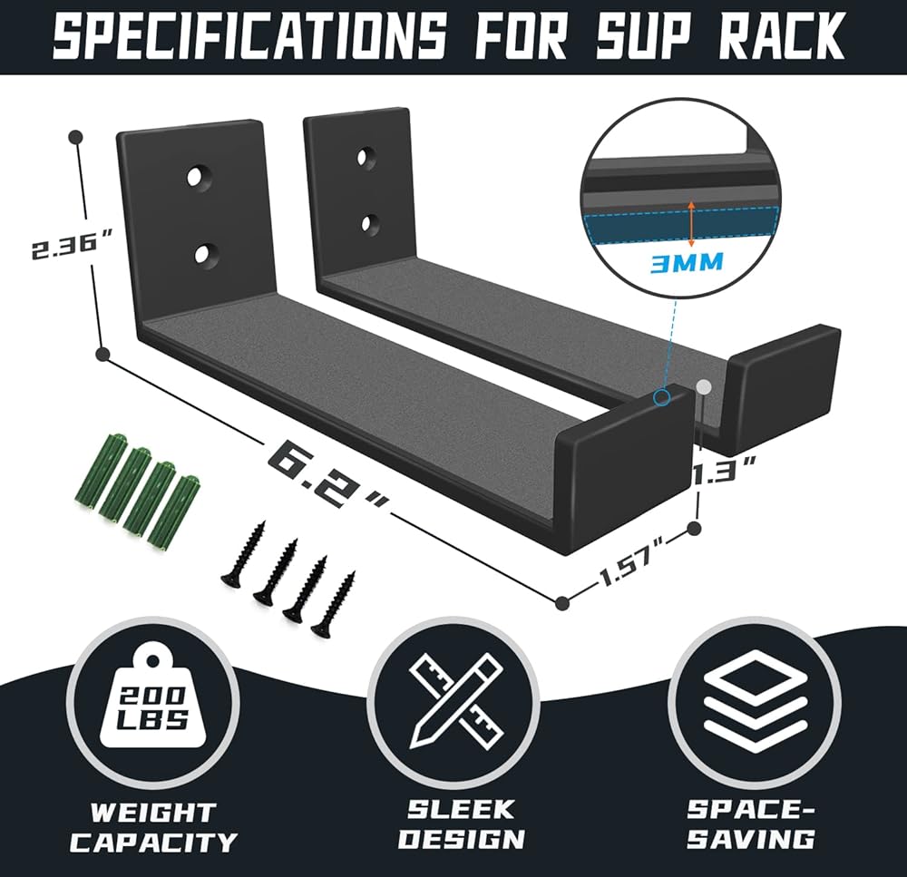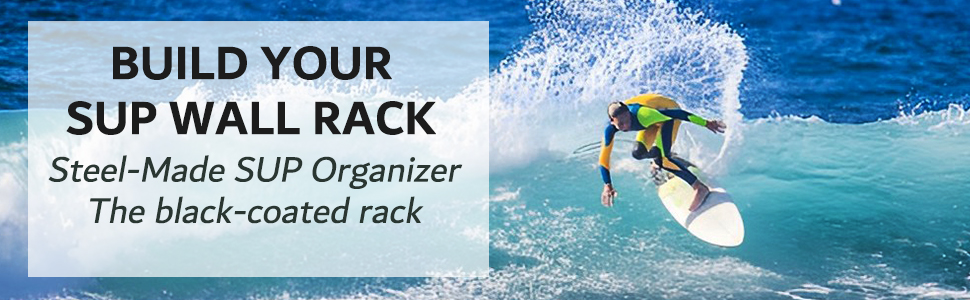 Space-Saver Matte black powder coat steel construction for shortboards, thrusters, fish, fun shapes, longboards, and more. Always feel bad about messy SUPs at home or damaging your SUP by putting them randomly? The SUP rack is such a helper for you to solve all troubles and have safe and clean places. The metal SUP rack allows you to store extra accessories by taking care of almost every kind of SUP gear without worrying about a messy one.
