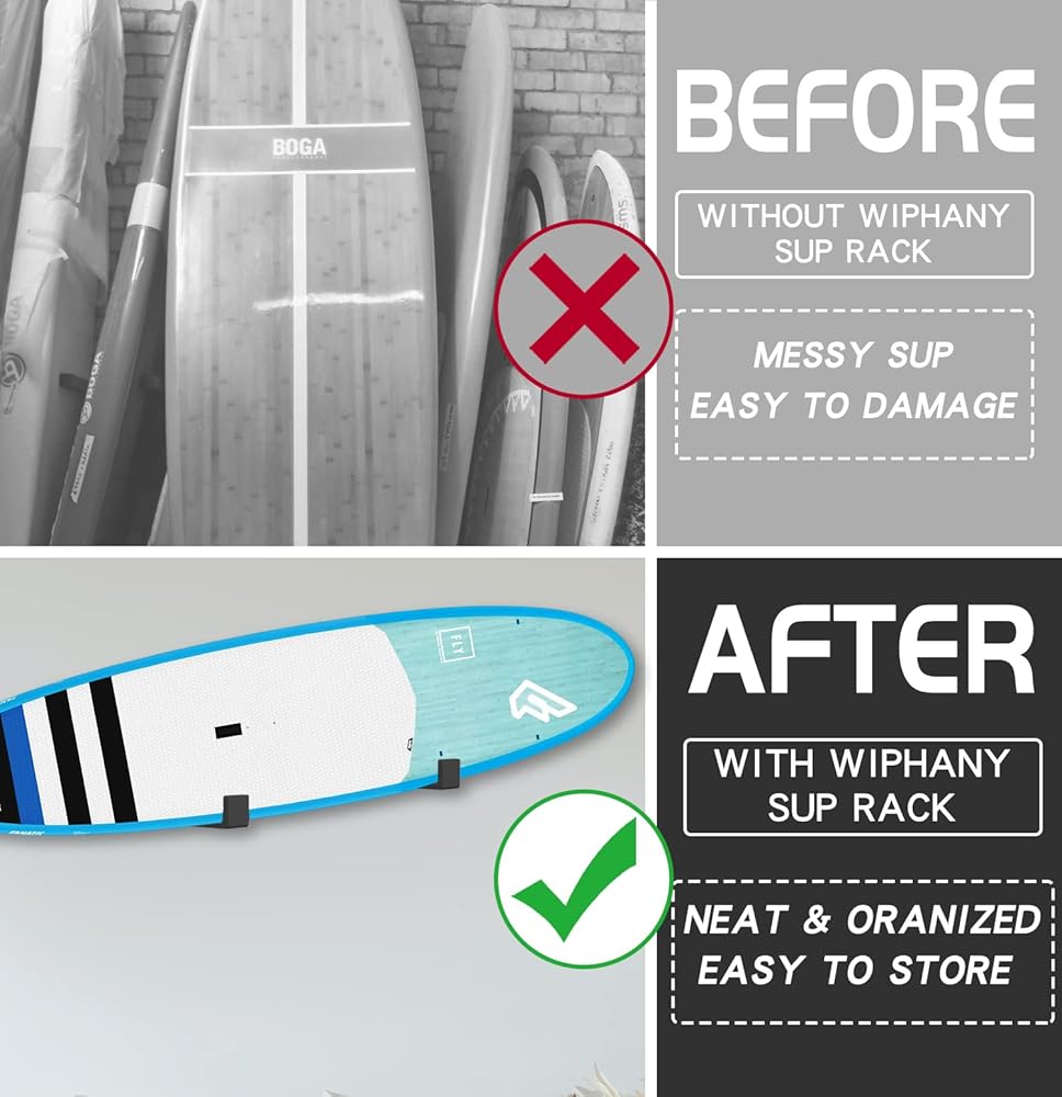 Easy Installing WIPHANY steel SUP rack is designed to display or store SUPs on the wall. The black-coating rack perfectly fits almost most types of SUPs on the market. The wall-mounted SUP holder can fit almost most types of guns on the market with 2 pack package. The large capacity of 100 Lbs, is sturdy and high-quality. Steel-made heavy-construction SUP organizer for all occasions like home walls, garage walls, or outdoor walls. It's very easy to hang or take for the users.