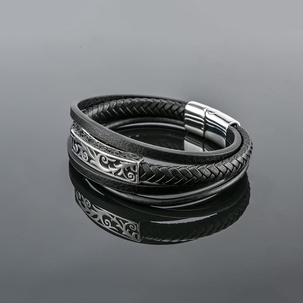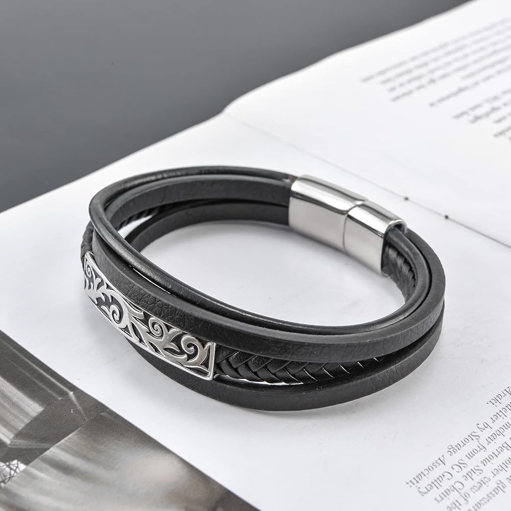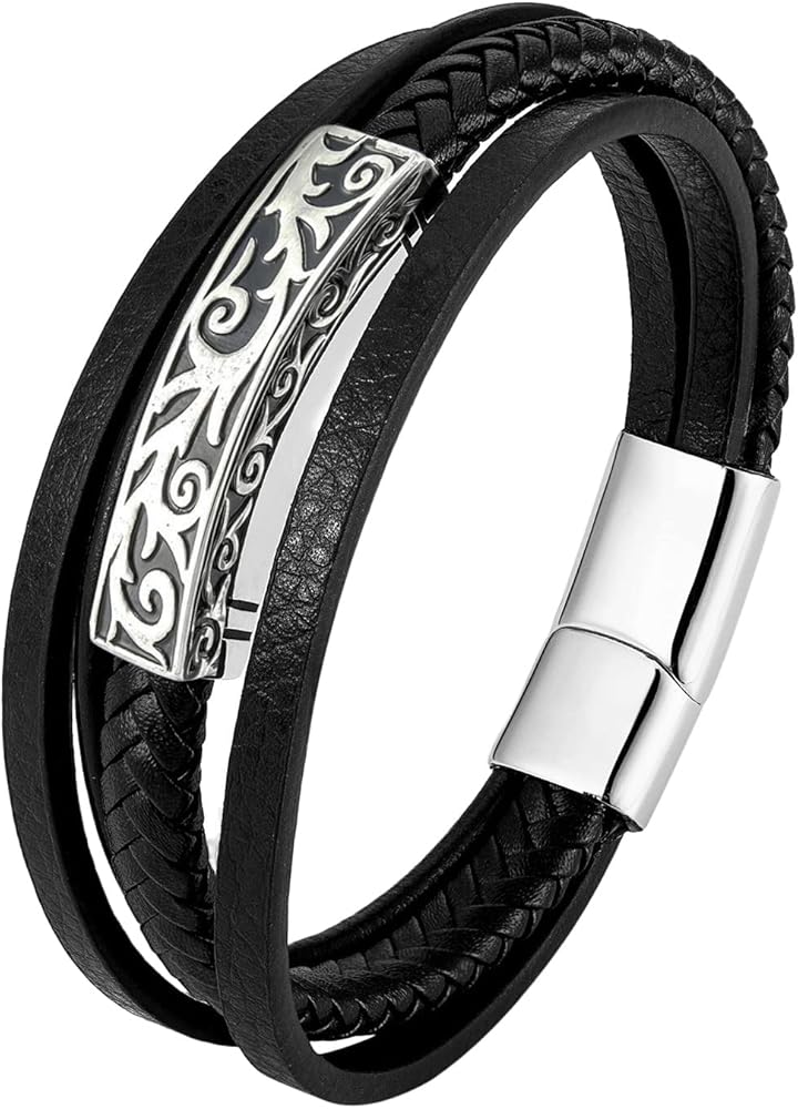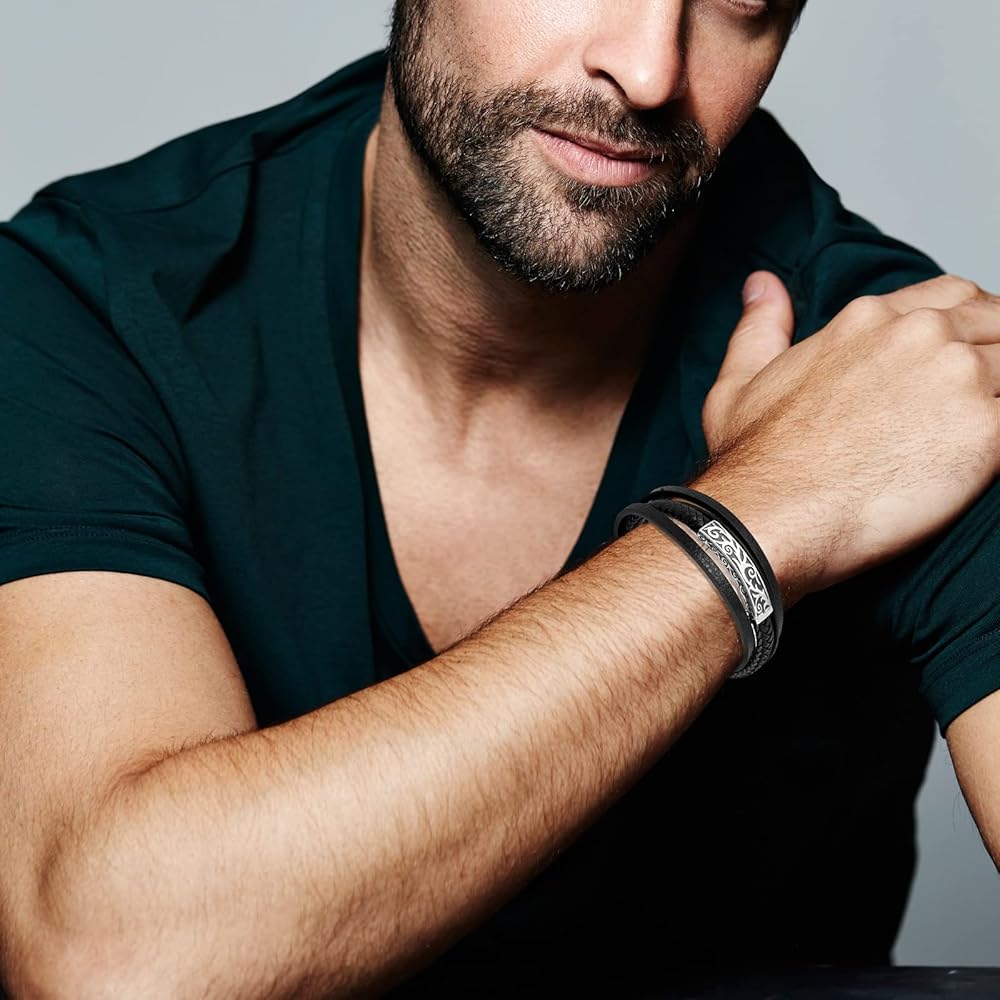 ♛التصميم♛سوار جلدي للرجال 316L من الفولاذ المقاوم للصدأ مجوهرات كلاسيكية متعددة الطبقات، 8.5 بوصة (21.5 سم)/النمط 2