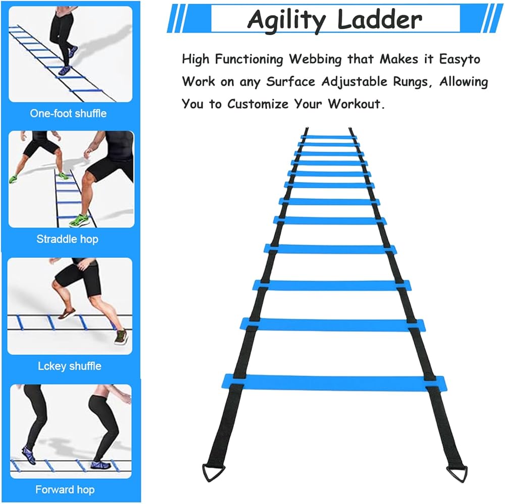 SPEED AGILITY TRAINING SET Our agility ladder speed training equipment includes 1 agility speed ladder, 4 x steel pegs , 20 disc cones, 1 x whistles and gym bag. Our professional-grade training tools are built to last. If you get it everything needed is ready to train body agility, speed, and explosive force.