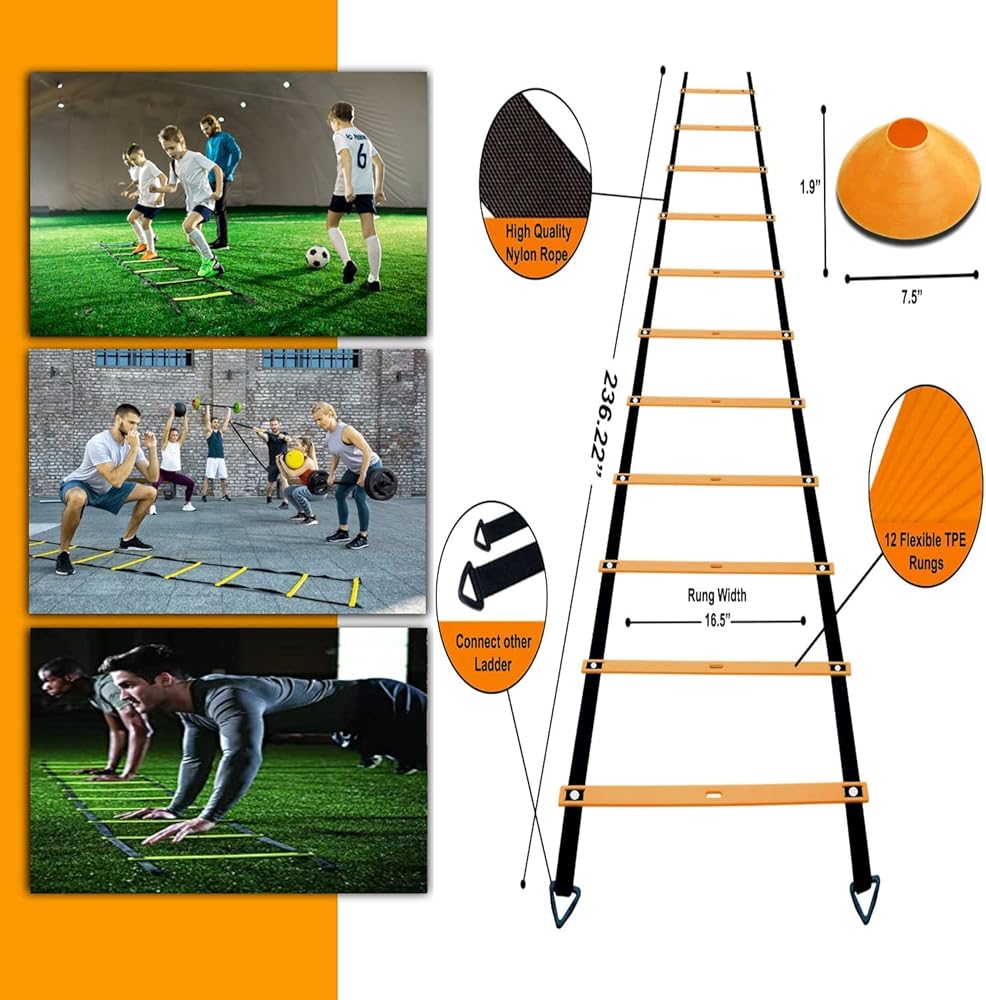 【مجموعة تدريب سريع الرشاقة】تتضمن سلماً خفة الحركة (60 قدمًا)، 5 حواجز تدريب سريعة قابلة للتعديل، 10 مخاريط أقراص، 1 كرة قدم، 1 حبل قفز و4 أوتاد فولاذ. مجموعة معدات تدريب رشاقة الحركة هذه ستصلك أسرع وأقوى. احصل على مستويات جديدة من الرشاقة والسرعة مع دوائر القدم السريعة والحركات الرملية.