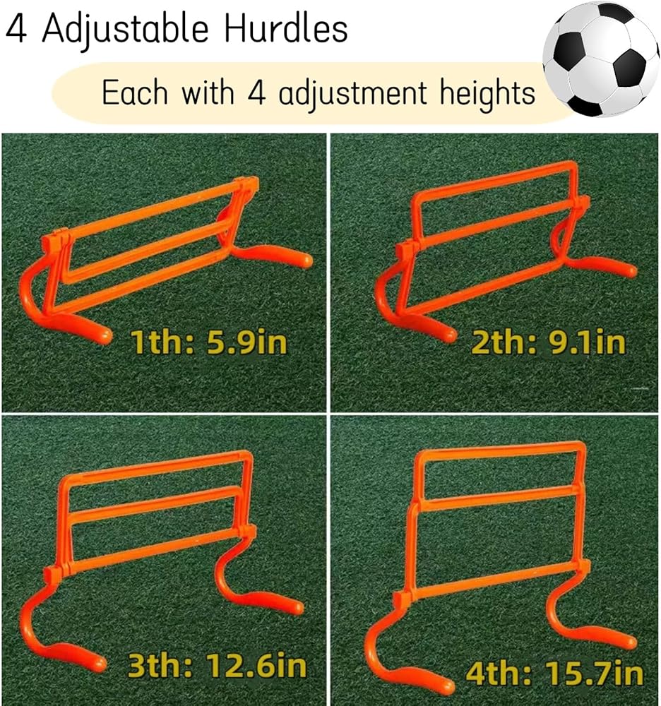 حزمة أدوات تدريب الرشاقة: تأتي حزمة معدات التدريب على الحواجز مع: سلم الرشاقة مع 12 درجة*1، حواجز قابلة للتعديل*4، مخاريط القرص*12، مدرب قوة الساق*2، مظلة الجري*1، حبل القفز*1، أوتاد*4 حقيبة حمل*1