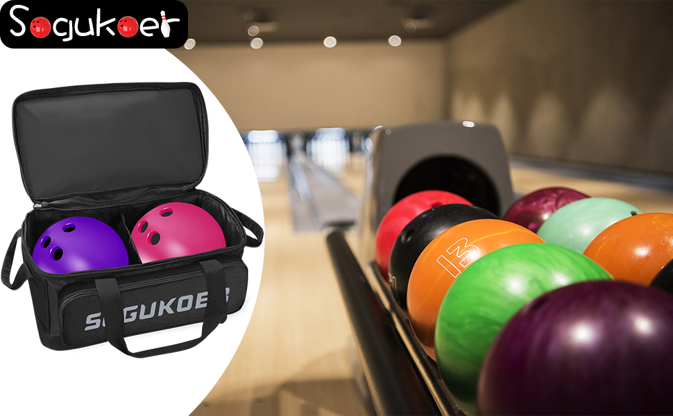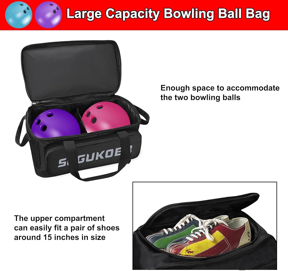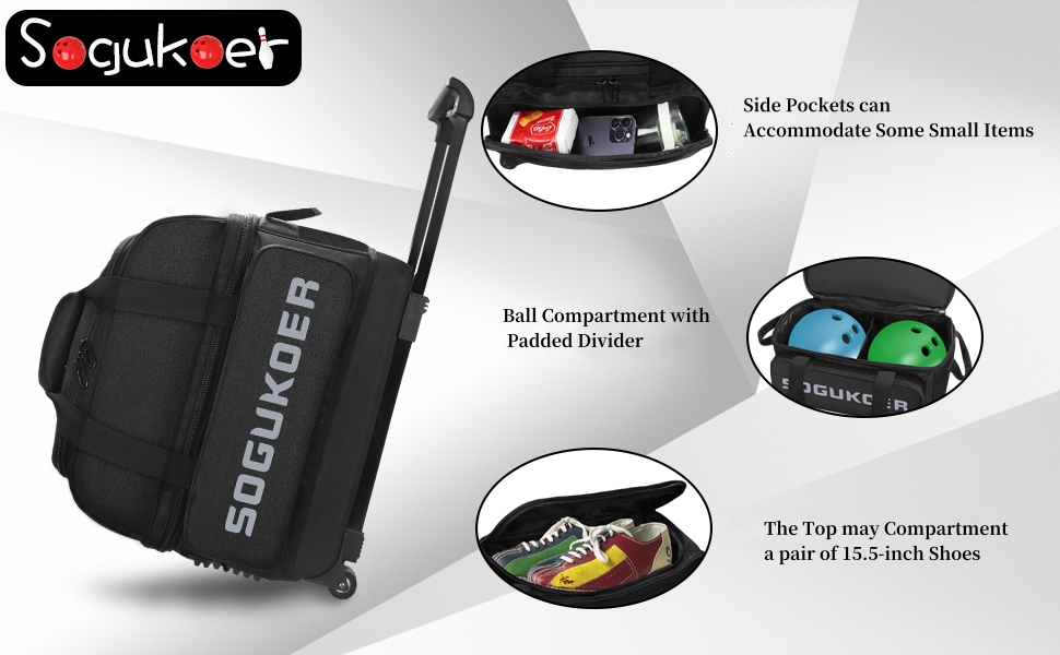 Capacity: Great amount of storage, The main compartment can easily accommodate 2 bowling balls, and the upper bag can store a pair of 15.5-inch shoes. The other bags can store water bottles, mobile phones, towels, keys, mobile phones, and other small items. Has a side handle to enable easier lifting to get in and out of the car.