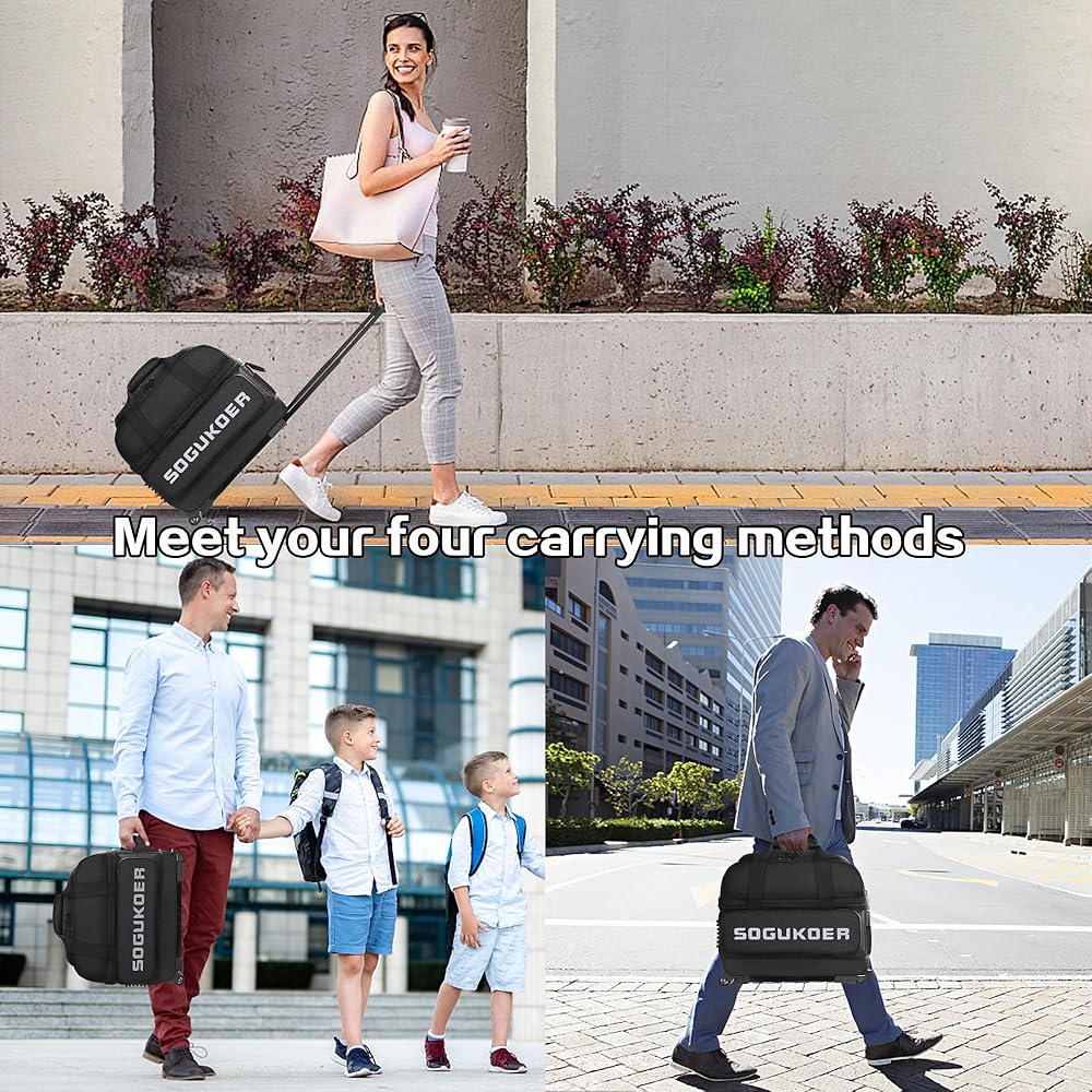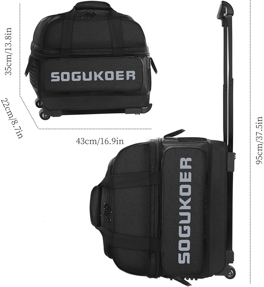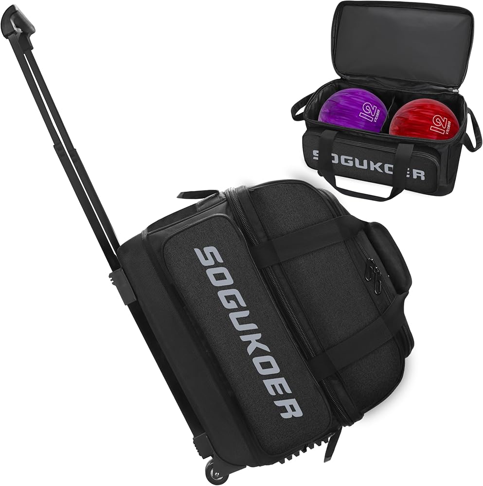 SOGUKOER عجلة مزدوجة 2 أكياس بولينج كروية مع عجلات، حقيبة بولينج بعجلات، بكرة مزدوجة 2 كرة بولينج يمكن وضع أحذية مع جهاز ثابت، حقيبة دوارة، مقبض قابل للسحب يمتد إلى 37.5 بوصة