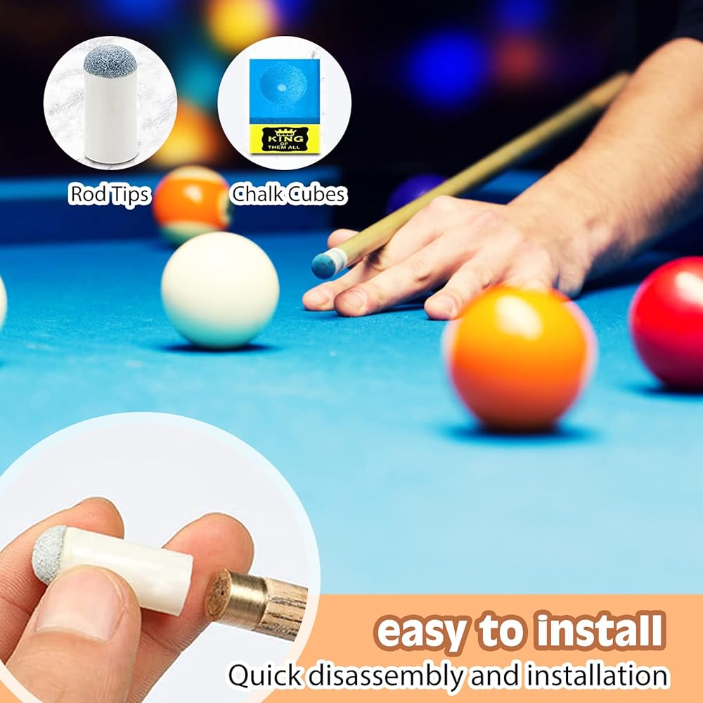 مزيج لطيف للصيانة -- يمكن وضع طباشير العصا على طرف عصا البلياردو، مما يزيد من قوة الاحتكاك بين رأس عصا البلياردو والكرة، لتحقيق ضرب دقيق؛ يمكن أن يساعدك مزيج من قطعة قماش التنظيف والأطراف البديلة في الحفاظ على عمود البلياردو جيدًا.