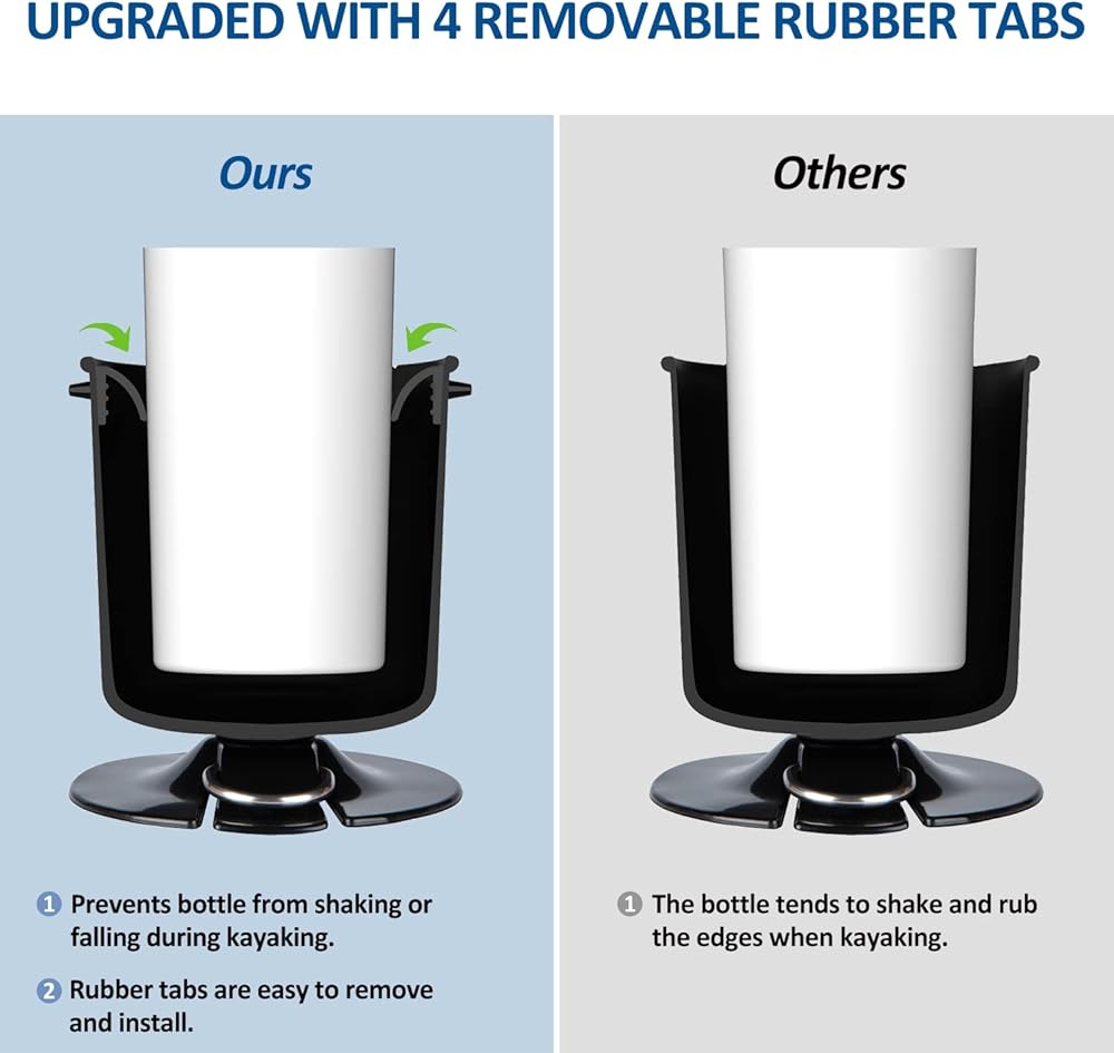 【تمت ترقيته باستخدام عروات وأكواب مطاطية قابلة للإزالة】- تم تصميم حامل أكواب الكاياك بـ 4 عروات أكواب مطاطية وقاعدة مطاطية في الجزء السفلي من الكوب لمنع الاهتزاز أو الانسكاب أو إحداث ضوضاء. تُستخدم الفتحات الموجودة في الجزء السفلي من حامل الأكواب للتصريف ومنع تراكم الماء.