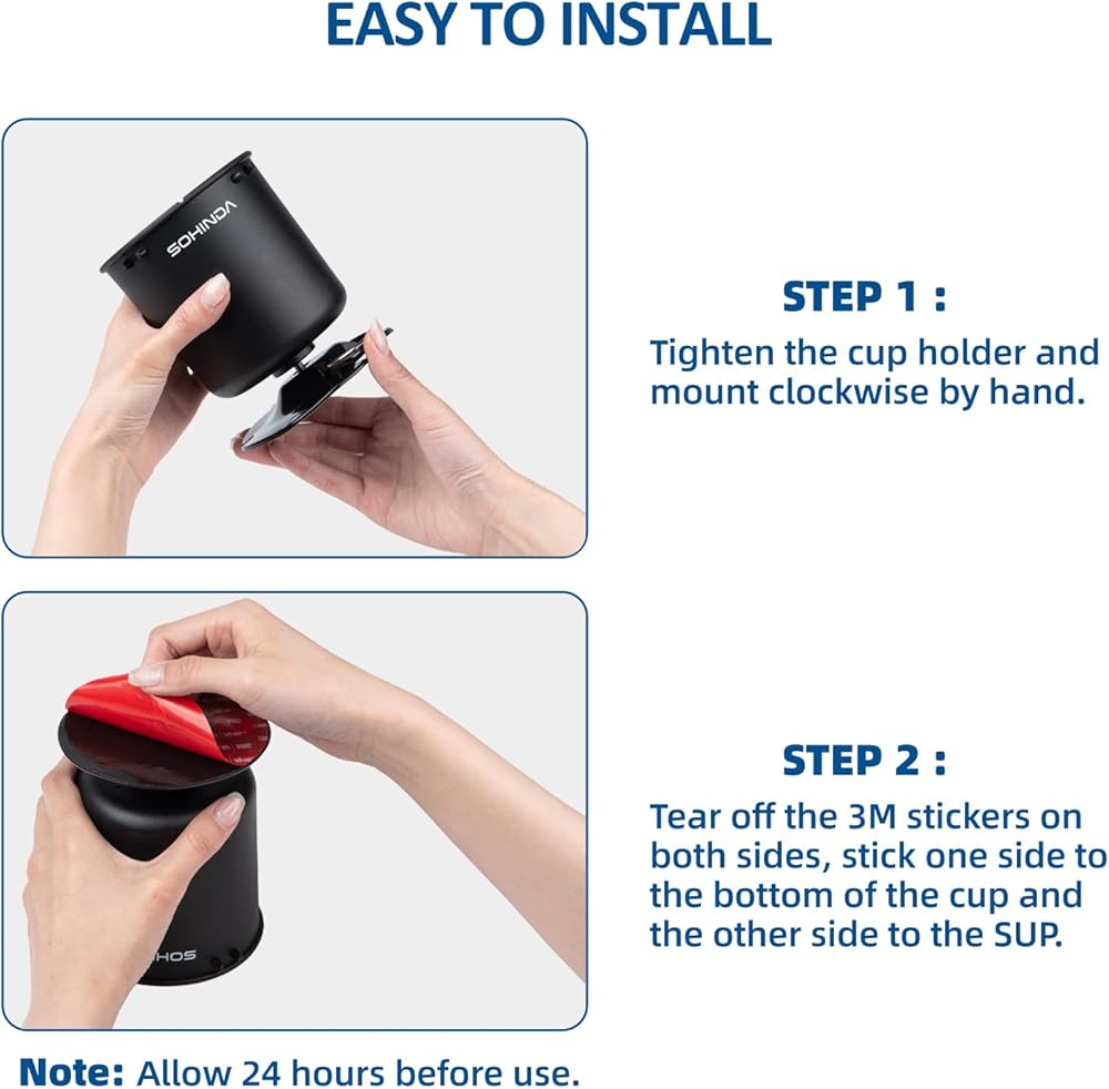 【سهلة التركيب】- الخطوة 1: قم بشد حامل الكوب وقم بتركيبه يدويًا في اتجاه عقارب الساعة. الخطوة 2: قم بتمزيق ملصقات 3M على كلا الجانبين، وألصق جانبًا واحدًا بأسفل الكوب والجانب الآخر بـ SUP. (ملاحظة: اتركه لمدة 24 ساعة قبل الاستخدام)