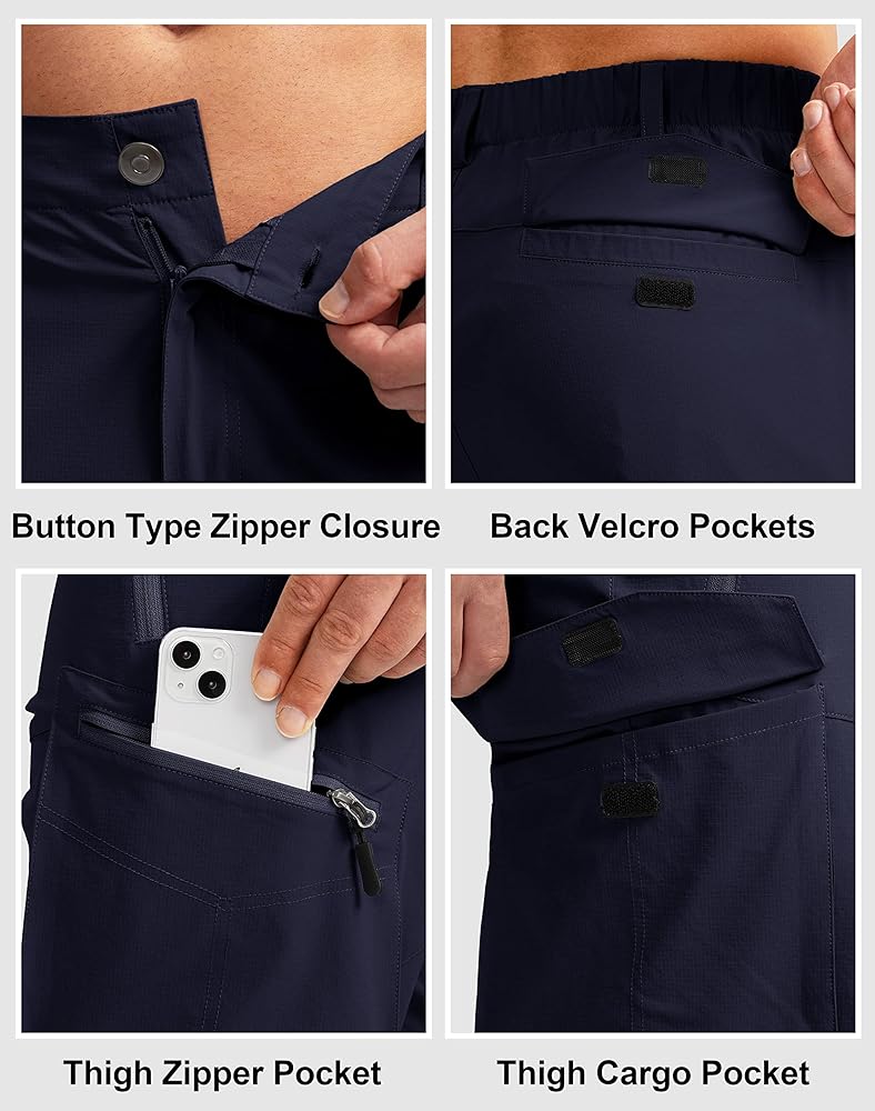 سراويل المشي لمسافات طويلة بخمسة جيوب: جيبان جانبيان بسحاب وجيب واحد بسحاب للفخذ الأيسر، مما يوفر مساحة تخزين آمنة لأبحاث المشي لمسافات طويلة في الهواء الطلق. 1 جيب كارجو للفخذ الأيمن و1 قطعة كارجو خلفية للاستخدام اليومي المريح.