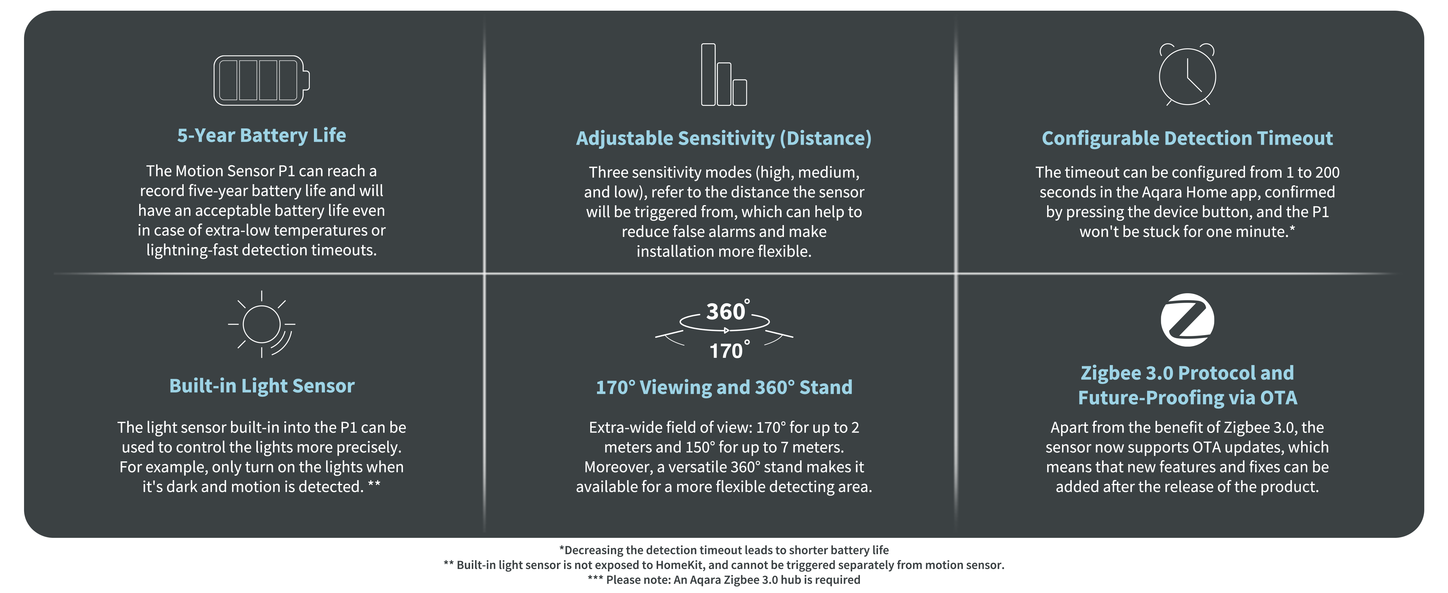 Notes: Requires Aqara Zigbee 3.0 hub and secured 2.4GHz Wi-Fi network connection. The P1 motion sensor is compatible with Aqara Home, HomeKit, Alexa, IFTTT and more. *Please update to the latest firmware version to use.