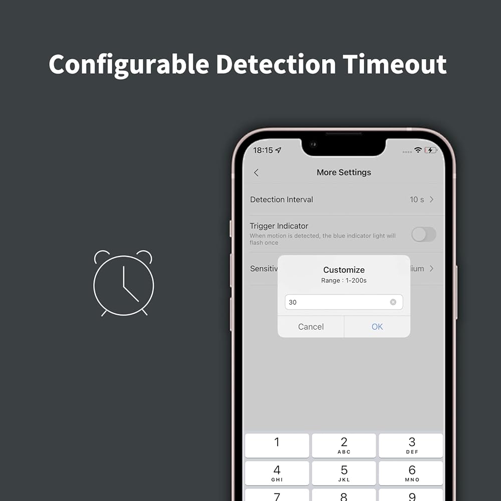 Adjustable Detection Time Limit: The detection time limit can be easily configured without the need for hardware changes. By configuring the time limit of 1-200s in the Aqara Home app, you can save energy or let the sensor detect every movement in no time.