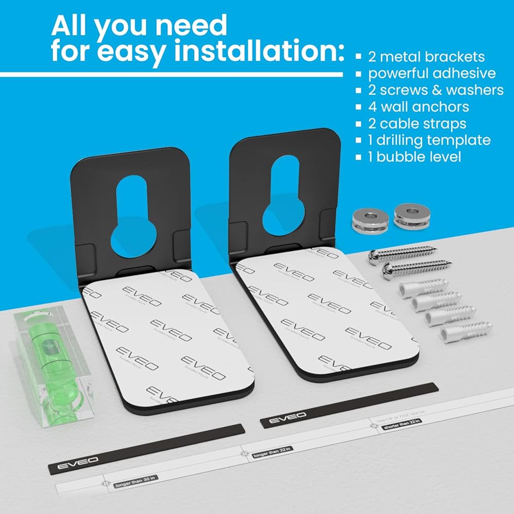 فكر عموديًا - ارفع مكبر الصوت الخاص بك باستخدام دعامات تثبيت شريط الصوت EVEO للتلفزيون وأنظمة الترفيه المنزلية. قم بتثبيت مكبرات الصوت العالمية الخاصة بك على الحائط باستخدام الأجهزة المضمنة في دقائق.