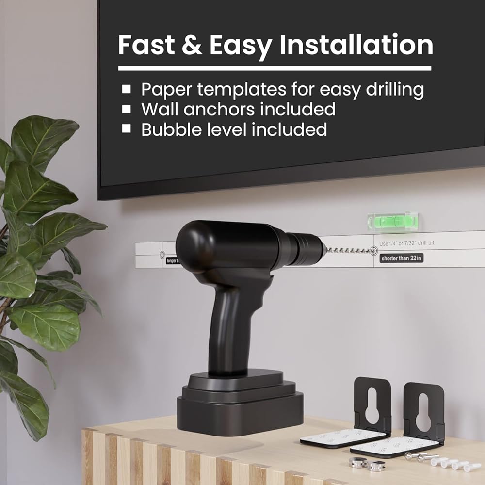 سهل التركيب - دعامة تثبيت شريط الصوت أسفل التلفزيون يمكنك بسهولة إقران حامل شريط الصوت على الحائط الخاص بك على شكل حرف L وتثبيت شريط الصوت الخاص بك، وقم بتعليق دعاماتك باستخدام مثبتات الحائط المضمنة ووضعها باستخدام قالب حفر مفيد. يأتي مع تعليمات لائقة للتثبيت الأسرع.