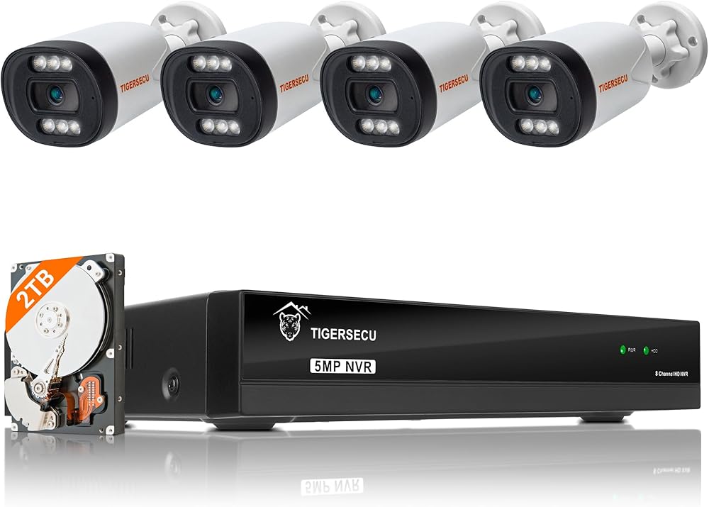 نظام كاميرا أمان TIGERSECU Ultra HD 5MP PoE NVR مع 4 كاميرات IP PoE، 8 قنوات NVR مع محرك أقراص ثابتة 2 تيرابايت، رؤية ليلية ملونة، إنذار صفارات الإنذار، كشف بشري بالذكاء الاصطناعي