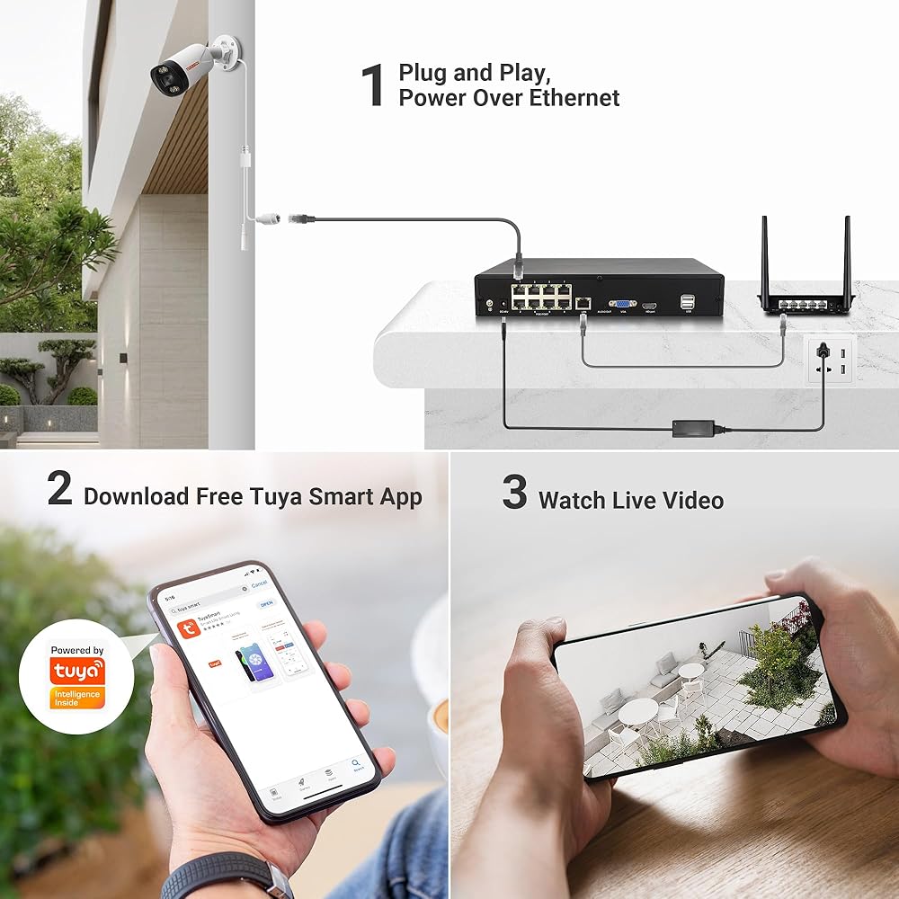تسجيل محلي مستمر على 8 قنوات لمدة تصل إلى 20 يومًا على محرك الأقراص الثابتة للمراقبة المثبت مسبقًا بسعة 2 تيرابايت (قابل للتوسيع حتى 16 تيرابايت). تنبيهات فورية عبر الهاتف المحمول والبريد الإلكتروني عند اكتشاف النشاط. المشاهدة المباشرة عن بعد على الأجهزة المحمولة التي تعمل بنظامي iOS وAndroid، وسطح المكتب على أنظمة Mac وWindows (متصفحات Chrome وEdge) عبر تطبيق Tuya Smart، بدون عقد أو رسوم شهرية.