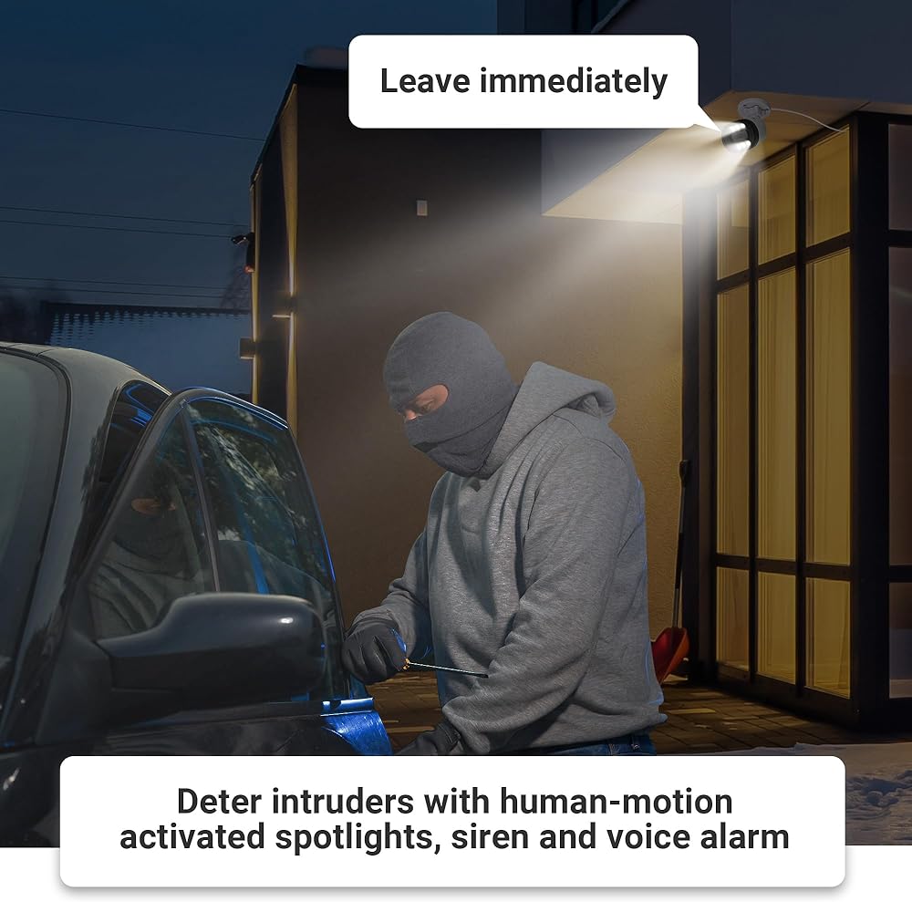 كاميرات IP66 معدنية شديدة التحمل مقاومة للعوامل الجوية للحماية الداخلية والخارجية في المطر والثلج والحرارة على مدار العام. قم بتخويف المتسللين باستخدام كاميرات الأضواء التي تحتوي على إضاءة الحركة وصفارات الإنذار. يتم تشغيل الأضواء الساطعة بحركة الإنسان. شاهد التفاصيل من خلال رؤية ليلية ملونة تصل إلى 100 قدم (30 مترًا).