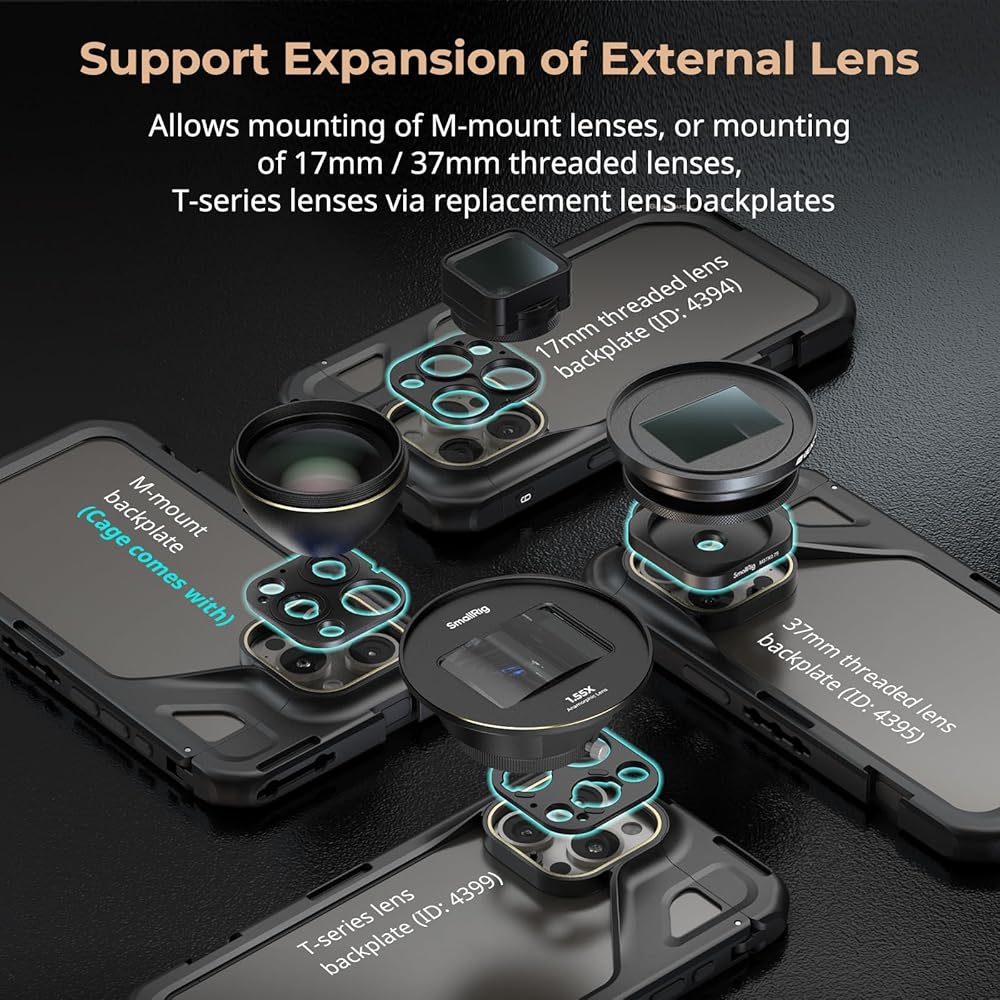 【مع حامل عدسة خارجي】يسمح جهاز فيديو الهاتف SmallRig بتركيب عدسة M-mount أو عن طريق استبدال اللوحة الخلفية للعدسة، وعدسة ملولبة 17 مم / 37 مم، ويناسب عدسة Moment T-series. (ملاحظة: حامل العدسة الملولب 17 مم / 37 مم 4394 / 4395 وحامل العدسة T-series 4399 غير متضمنين ويجب شراؤهما بشكل منفصل)