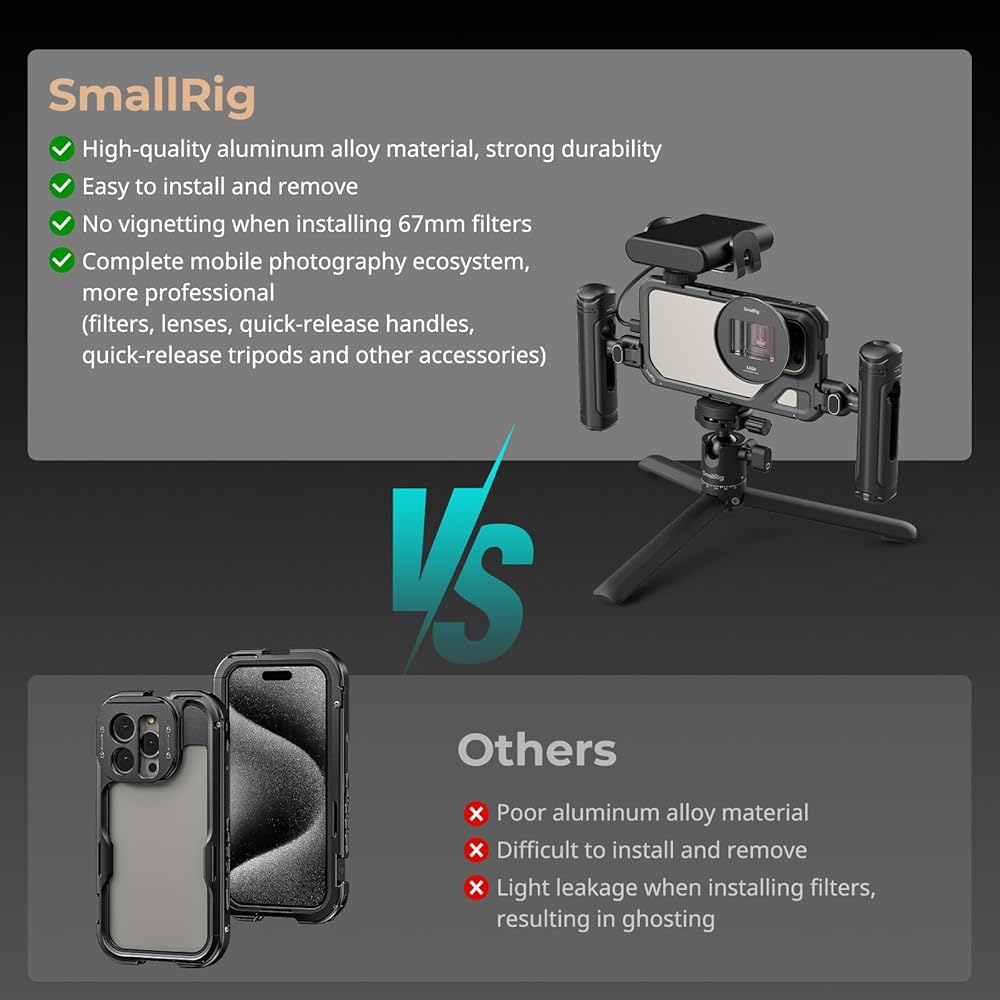 【لهاتف iPhone 15 Pro Max】تم تصميم مجموعة الفيديو المحمولة SmallRig 4393 خصيصًا لهاتف iPhone 15 Pro Max، وتتميز بمقبض جانبي سريع التحرير للتحكم اللاسلكي من أجل التصوير الفعال "بنقرة واحدة".