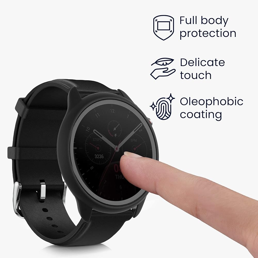 متينة: يوفر الزجاج المقوى بإطار بلاستيكي حماية كاملة للجسم والشاشة للساعة أو جهاز تتبع اللياقة البدنية