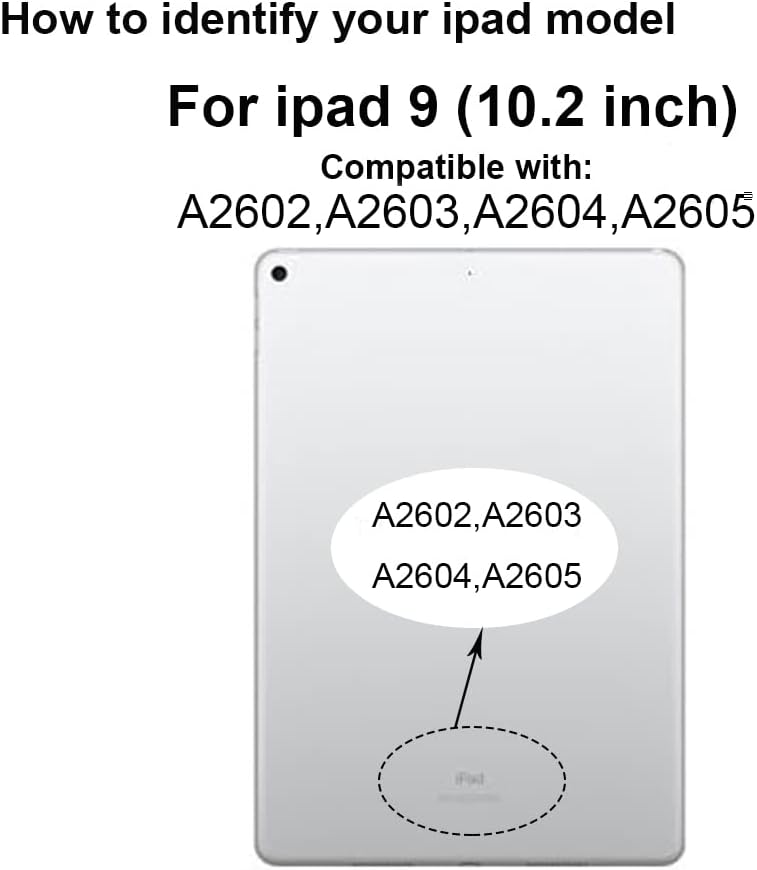 الموديلات المتوافقة: فقط لجهاز ايباد الجيل التاسع 10.2 انش، الموديل (A2602 A2603 A2604 A2605)، (شاشة ال سي دي غير متضمنة). يرجى التأكد من تحديد الطراز الخاص بك بشكل صحيح قبل الشراء. يمكنك العثور على رقم الموديل على الجزء الخلفي من جهازك. قد يؤدي الطراز الخاطئ إلى إتلاف وسادتك.