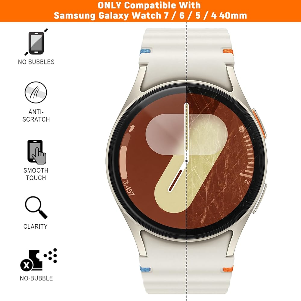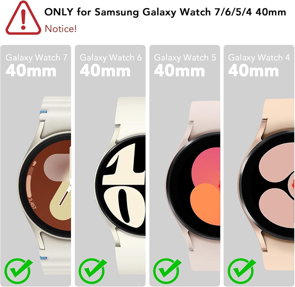 الاستخدام: متوافق مع ساعة سامسونج جالاكسي 6 40 ملم (إصدار جديد 2023) وسامسونج جالاكسي ووتش 5 40 ملم (2022) وسامسونج جالاكسي ووتش 4 40 ملم (2021). غير متوافق مع الموديلات الأخرى. 40 ملم يشير إلى طراز الساعة الذكية: ساعة سامسونج جالكسي 6 40 ملم، سامسونج 5 40 ملم أو ساعة سامسونج 4 40 ملم، وليس حجم الشاشة. يوفر واقي شاشة ساعة جالكسي 6 / 5 / 4 مقاس 40 ملم من الزجاج المقوى حماية خارجية لساعة سامسونج 4/5/6 الخاصة بك دون المساس بإمكانية الاستخدام، كما يمكن إزالته بسهولة!