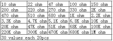 - تشتمل تشكيلة المقاومات هذه على 30 قيمة مختلفة: 10 أوم، 22 أوم، 47 أوم، 100 أوم، 150 أوم، 200 أوم، 220 أوم، 270 أوم، 330 أوم، 470 أوم، 510 أوم، 680 أوم، 1 كيلو أوم، 2 كيلو أوم، 2.2 كيلو. أوم 3.3K أوم، 4.7K أوم، 5.1K أوم، 6.8K أوم، 10K أوم 20K أوم، 47K أوم، 51K أوم، 68K أوم، 100K أوم 220K أوم، 300K أوم، 470K أوم، 680K أوم، 1M أوم