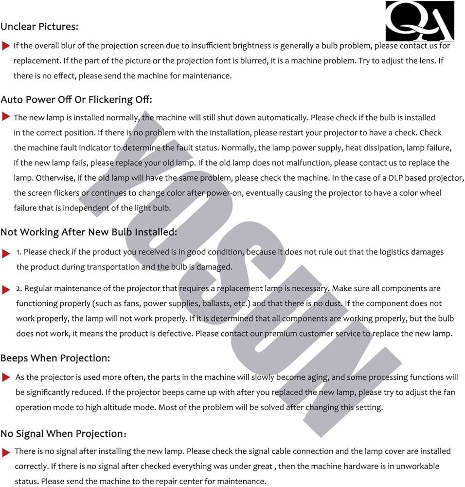 التركيب والسلامة: ستجد أنه من السهل جدًا تركيبه في جهاز العرض الخاص بك كطرق إخراج المصباح القديم. قم بإيقاف تشغيل جهاز العرض الخاص بك عند تركيبه.