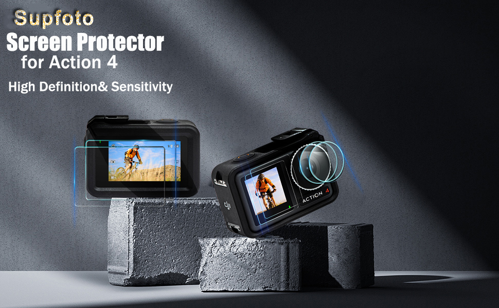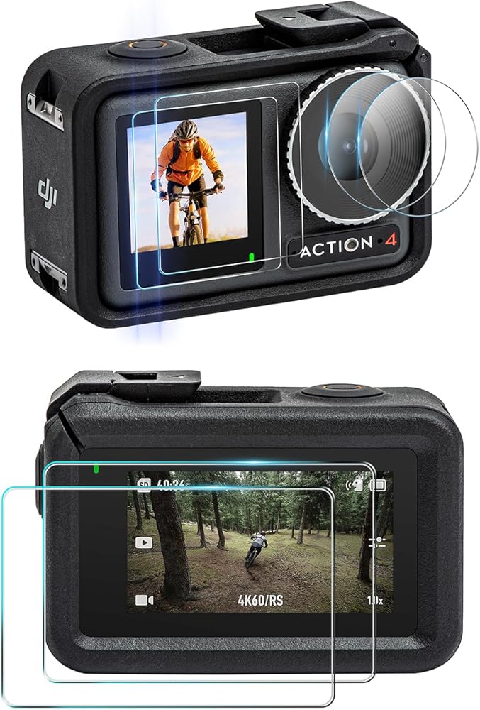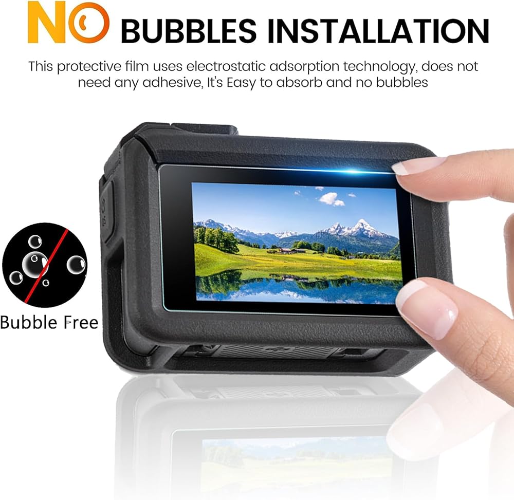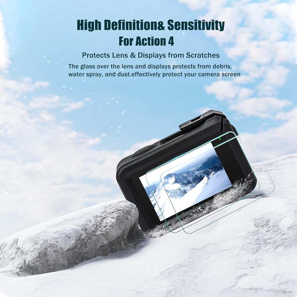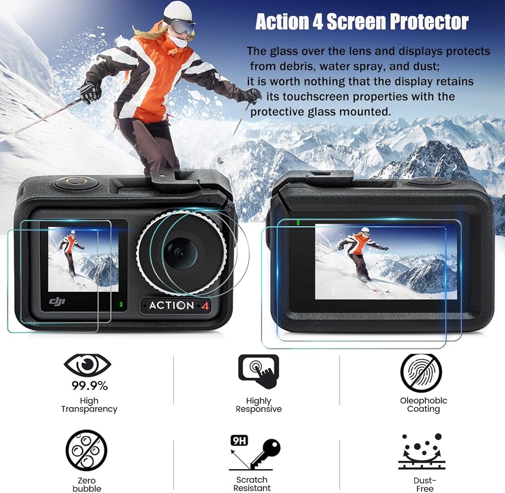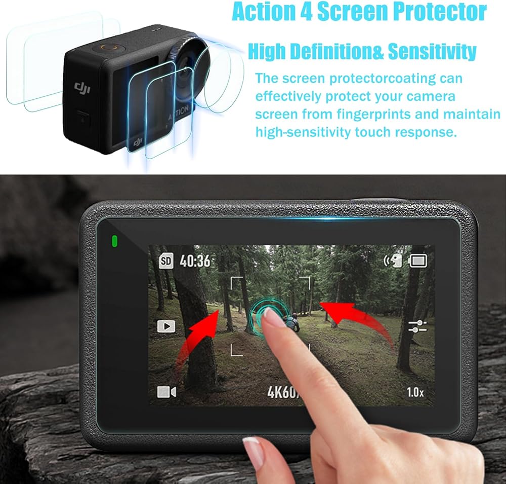 【مجموعة واقي الزجاج المقسى لـ DJI Action 4 】تتكون مجموعة الغشاء الواقي المقوى لكاميرا DJI Action 4 من أجزاء فيلم مصممة لحماية العدسات والشاشة الأمامية والشاشة الخلفية لـ DJI Action 4.