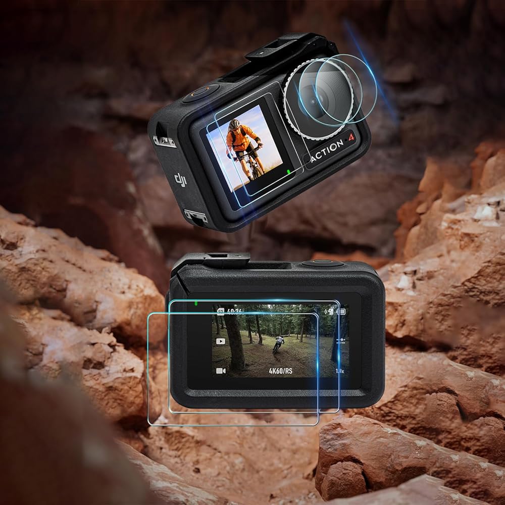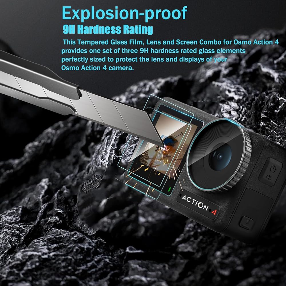 تصنيف صلابة 9H: يوفر هذا الفيلم الزجاجي المقوى والعدسة والشاشة لـ Osmo Action 4 مجموعة واحدة من ثلاثة عناصر زجاجية مصنفة صلابة 9H بحجم مثالي لحماية العدسات وشاشات كاميرا Osmo Action 4 الخاصة بك.