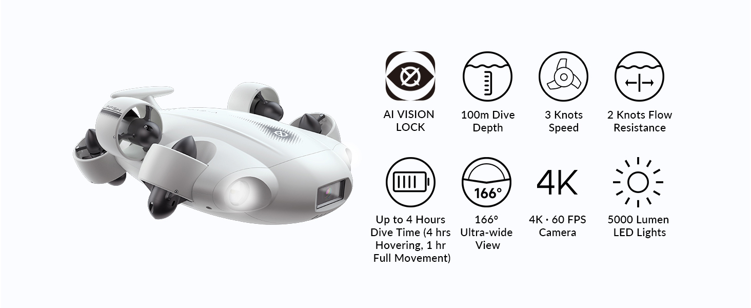 قفل الرؤية بالذكاء الاصطناعي: تطلق ميزة قفل الرؤية في FIFISH V-EVO العنان لمجموعة من القدرات البديهية التي تحافظ على تركيز أهدافك بشكل آمن. يمكنك تحديد موضع الكائنات بدقة عالية، والتحرك بشكل تكيفي وتلقائي لتثبيت الأهداف في الوقت الفعلي.