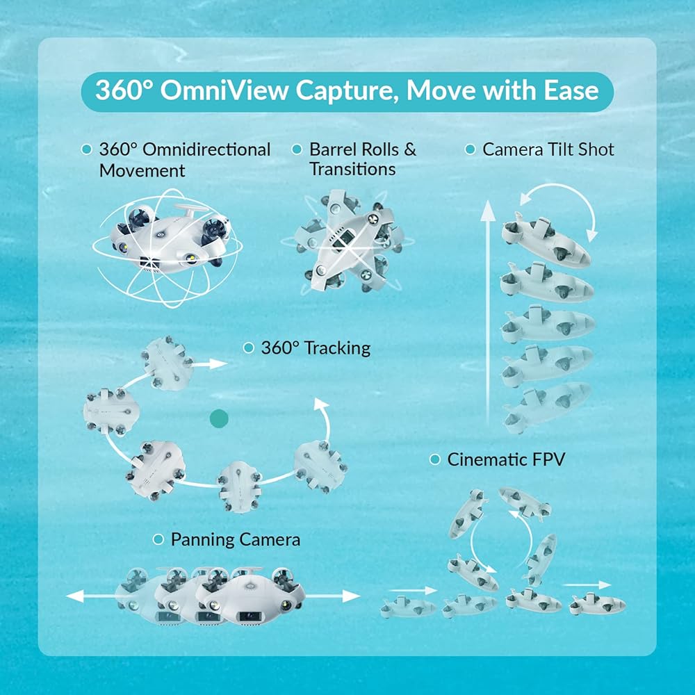 إمكانية التنقل في جميع الاتجاهات بزاوية 360 درجة: تجاوز حدود الطرق التقليدية، وحقق الحرية الكاملة بزاوية 360 درجة في التنقل تحت الماء، والتحليق، والثبات في الوضعية. حوّل خيالك الإبداعي إلى واقع تصوير سينمائي بدقة 4K.