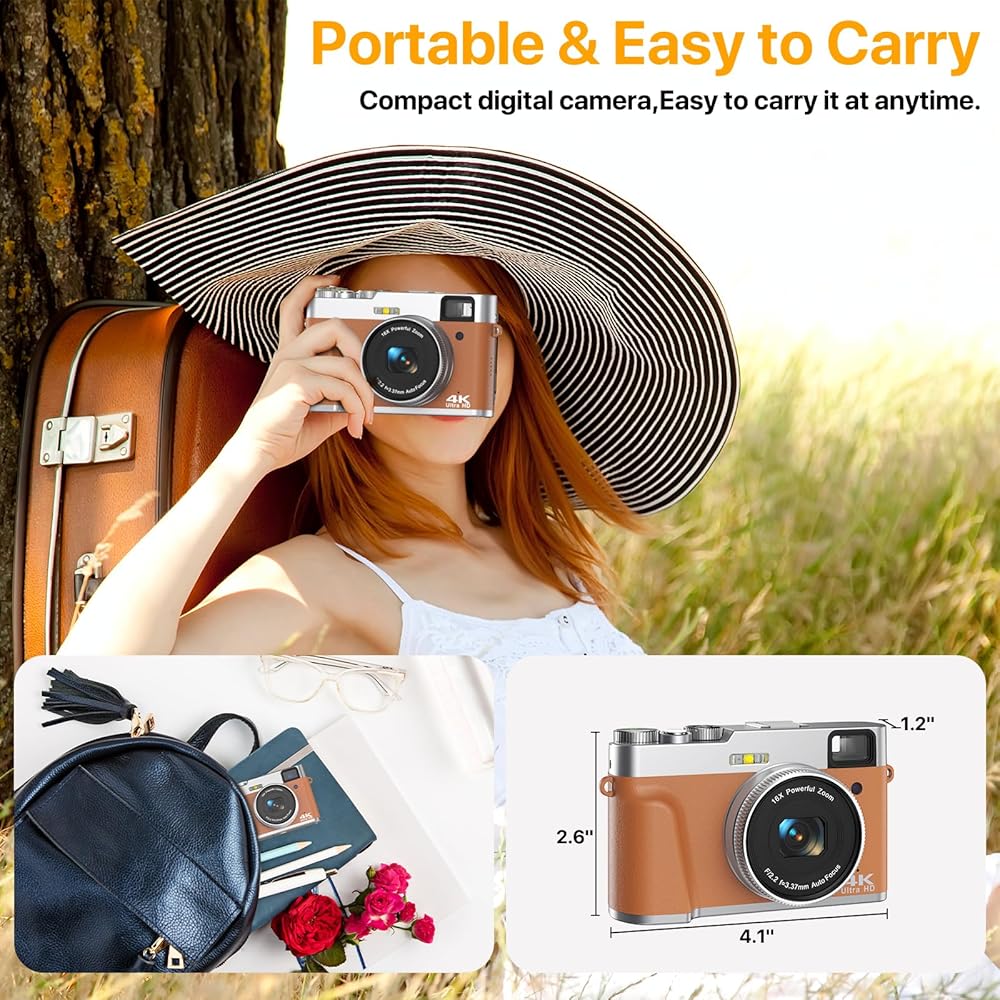 📷【مجموعة هدايا كاميرا رقمية صغيرة】كاميرا رقمية تزن 0.4 رطل فقط، مزودة بشاشة IPS مقاس 2.8 بوصة. يسهل حملها إلى أي مكان، ويمكنك التقاط الصور وتسجيل الفيديو بسهولة لفترة طويلة. تتضمن الحزمة كاميرا رقمية 4K، وبطاقة Micro SD بسعة 32 جيجابايت، وبطاريتين قابلتين للشحن، وغطاء عدسة، وكابل HDMl، وكابل من النوع C، وحقيبة كاميرا، وقماش تنظيف العدسة/الشاشة، وحزام معصم الكاميرا، ودليل المستخدم. إنها بالتأكيد هدية مثالية للمبتدئين في التصوير الفوتوغرافي.