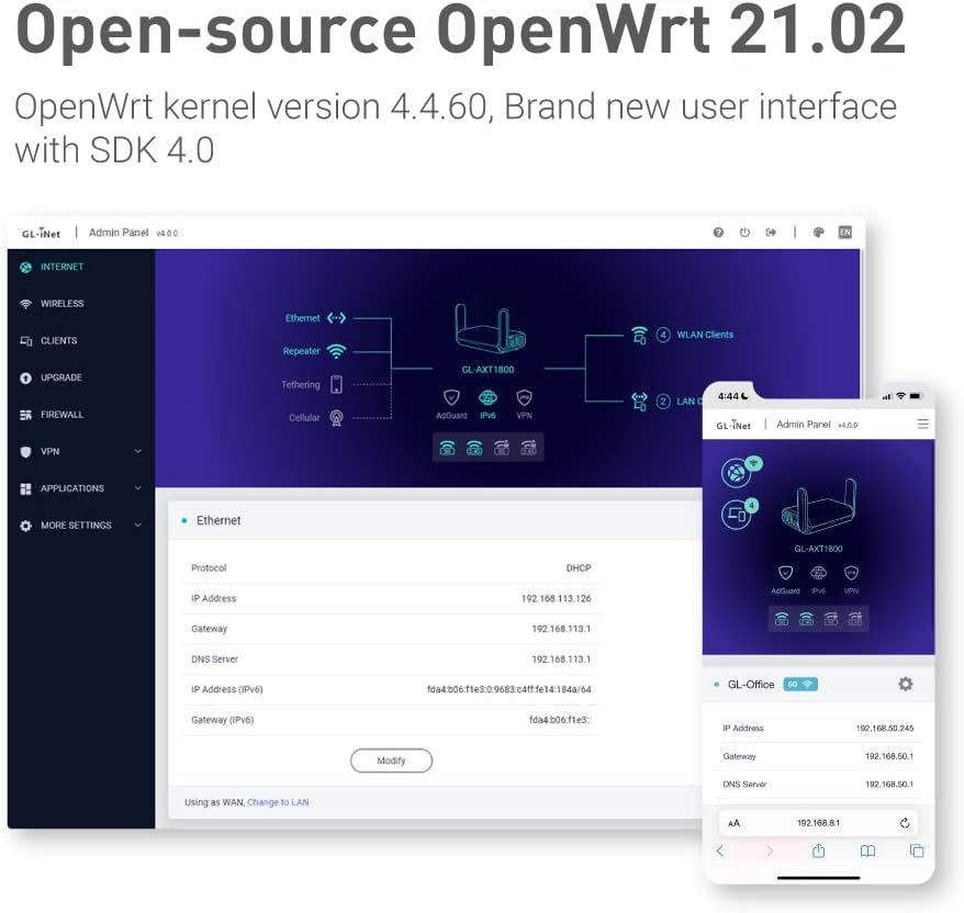 • 【يعمل على OpenWrt 21.02】يعمل Slate AX على أحدث نظام تشغيل OpenWrt 21.02 (إصدار Kernel 4.4.60)، مع إمكانات اتصال كبيرة بالجهاز، وتقليل تداخل الإشارة بشكل كبير. يمكنك تخصيص جهاز التوجيه وتثبيت التطبيقات بناءً على تفضيلاتك.